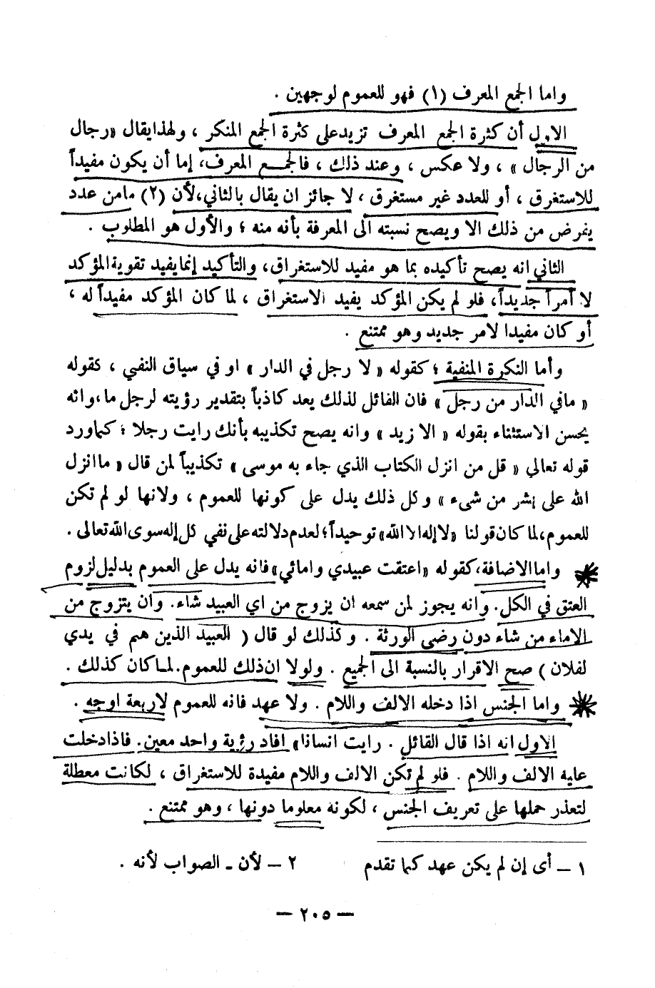 وَأَمَّا الْجَمْعُ الْمُعَرَّفُ (١) فَهُوَ لِلْعُمُومِ لِوَجْهَيْنِ: الْأَوَّلُ: أَنَّ كَثْرَةَ الْجَمْعِ الْمُعَرَّفِ تَزِيدُ عَلَى كَثْرَةِ الْجَمْعِ الْمُنَكَّرِ، وَلِهَذَا يُقَالُ رِجَالٌ مِنَ الرِّجَالِ وَلَا عَكْسَ، وَعِنْدَ ذَلِكَ فَالْجَمْعُ الْمُعَرَّفُ إِمَّا أَنْ يَكُونَ مُفِيدًا لِلِاسْتِغْرَاقِ أَوْ لِلْعَدَدِ غَيْرَ مُسْتَغْرِقٍ لَا جَائِزٌ أَنْ يُقَالَ بِالثَّانِي، لِأَنَّ (٢) مَا مِنْ عَدَدٍ يُفْرَضُ مِنْ ذَلِكَ إِلَّا وَيَصِحُّ نِسْبَتُهُ إِلَى الْمَعْرِفَةِ بِأَنَّهُ مِنْهُ وَالْأَوَّلُ هُوَ الْمَطْلُوبُ.