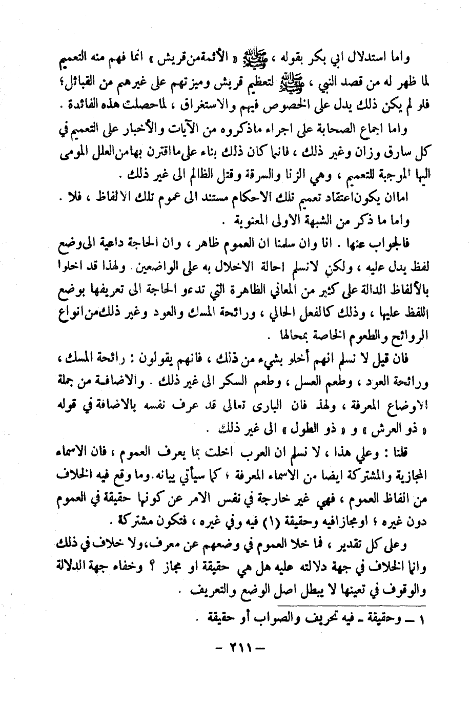 وَأَمَّا إِجْمَاعُ الصَّحَابَةِ عَلَى إِجْرَاءِ مَا ذَكَرُوهُ مِنَ الْآيَاتِ وَالْأَخْبَارِ عَلَى التَّعْمِيمِ فِي كُلِّ سَارِقٍ وَزَانٍ وَغَيْرِ ذَلِكَ، فَإِنَّمَا كَانَ ذَلِكَ بِنَاءً عَلَى مَا اقْتَرَنَ بِهَا مِنَ الْعِلَلِ الْمُومَى إِلَيْهَا الْمُوجِبَةِ لِلتَّعْمِيمِ، وَهِيَ السَّرِقَةُ وَالزِّنَى وَقَتْلُ الظَّالِمِ إِلَى غَيْرِ ذَلِكَ، أَمَّا أَنْ يَكُونَ اعْتِقَادُ تَعْمِيمِ تِلْكَ الْأَحْكَامِ مُسْتَنِدًا إِلَى عُمُومِ تِلْكَ الْأَلْفَاظِ فَلَا.