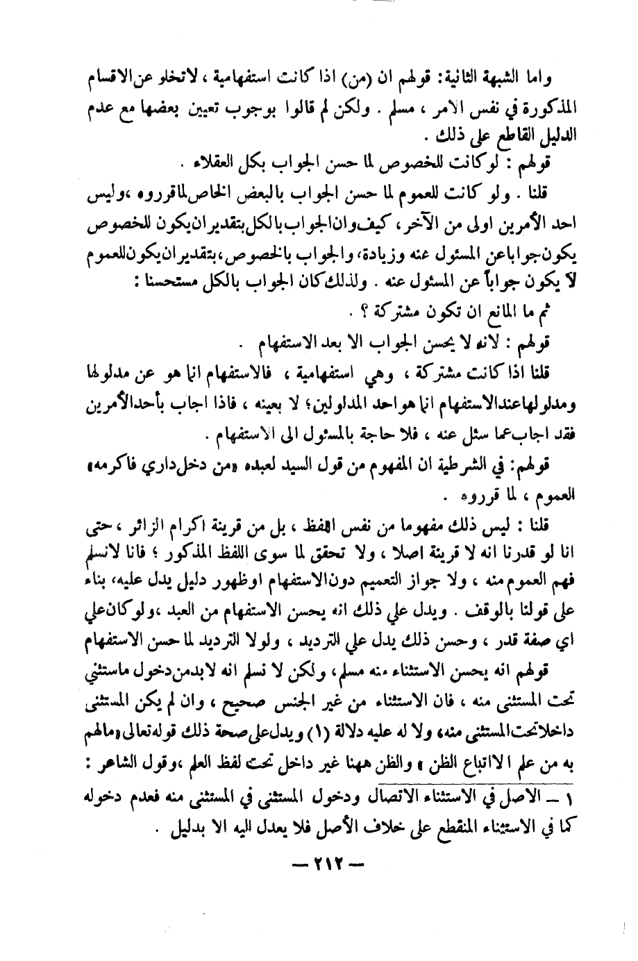 (١) الْأَصْلُ فِي الِاسْتِثْنَاءِ الِاتِّصَالُ وَدُخُولُ الْمُسْتَثْنَى فِي الْمُسْتَثْنَى مِنْهُ، فَعَدَمُ دُخُولِهِ كَمَا فِي الِاسْتِثْنَاءِ الْمُنْقَطِعِ عَلَى خِلَافِ الْأَصْلِ، فَلَا يُعْدَلُ إِلَيْهِ إِلَّا بِدَلِيلٍ