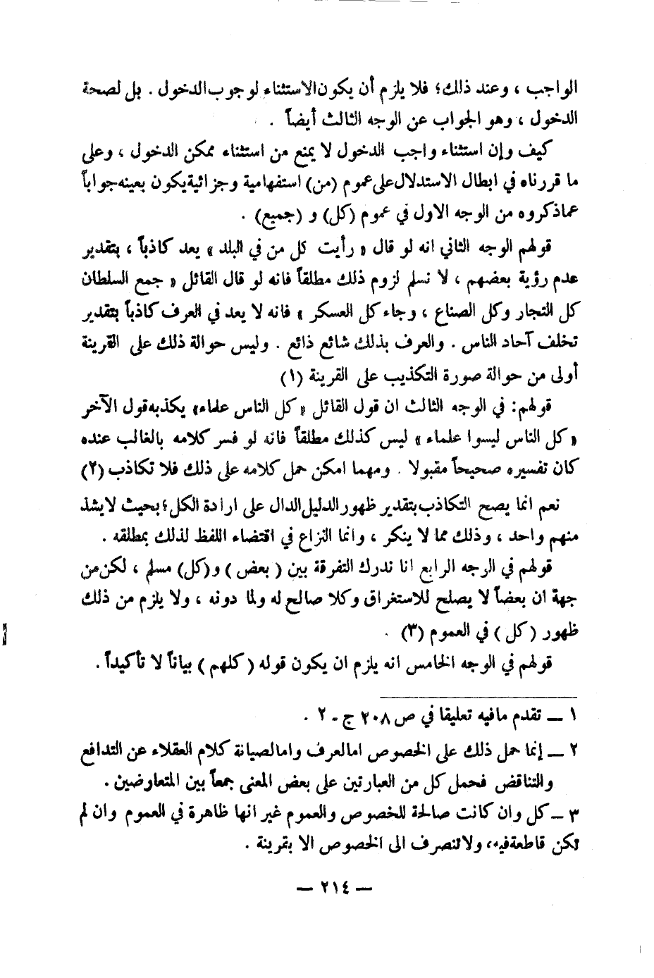 (٢) إِنَّمَا حُمِلَ ذَلِكَ عَلَى الْخُصُوصِ إِمَّا لِعُرْفٍ وَإِمَّا لِصِيَانَةِ كَلَامِ الْعُقَلَاءِ عَنِ التَّدَافُعِ وَالتَّنَاقُضِ، فَحُمِلَ كُلٌّ مِنَ الْعِبَارَتَيْنِ عَلَى بَعْضِ الْمَعْنَى جَمْعًا بَيْنَ الْمُتَعَارِضَيْنِ