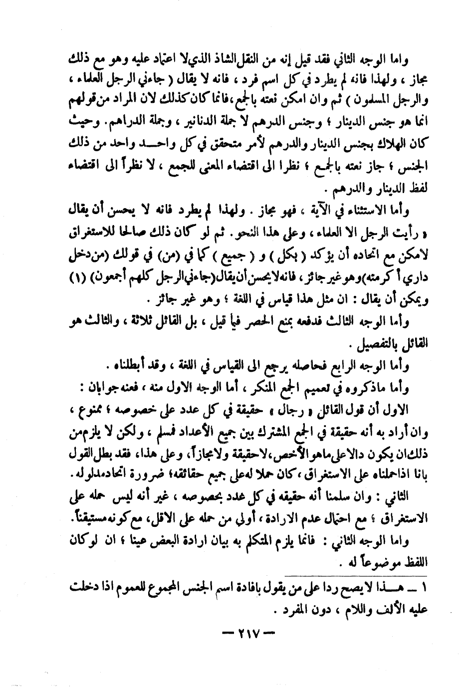 (١) هَذَا لَا يَصِحُّ رَدًّا عَلَى مَنْ يَقُولُ بِإِفَادَةِ اسْمِ الْجِنْسِ الْمَجْمُوعِ لِلْعُمُومِ إِذَا دَخَلَتْ عَلَيْهِ الْأَلِفُ وَاللَّامُ دُونَ الْمُفْرَدِ