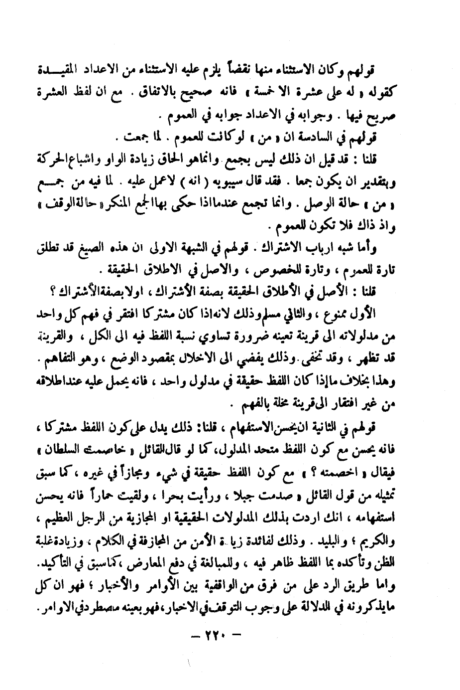 قُلْنَا: ذَلِكَ لَا يَدُلُّ عَلَى كَوْنِ اللَّفْظِ مُشْتَرَكًا، فَإِنَّهُ يَحْسُنُ مَعَ كَوْنِ اللَّفْظِ مُتَّحِدَ الْمَدْلُولِ كَمَا لَوْ قَالَ الْقَائِلُ: خَاصَمْتُ السُّلْطَانَ، فَيُقَالُ: أَخَصَمْتُهُ؟ مَعَ كَوْنِ اللَّفْظِ حَقِيقَةً فِي شَيْءٍ وَمَجَازًا فِي غَيْرِهِ كَمَا سَبَقَ تَمْثِيلُهُ مِنْ قَوْلِ الْقَائِلِ: صَدَمْتُ جَبَلًا وَرَأَيْتُ بَحْرًا وَلَقِيتُ حِمَارًا، فَإِنَّهُ يَحْسُنُ اسْتِفْهَامُهُ، إِنَّكَ أَرَدْتَ بِذَلِكَ الْمَدْلُولَاتِ الْحَقِيقِيَّةَ أَوِ الْمَجَازِيَّةَ مِنَ الرَّجُلِ الْعَظِيمِ وَالْكَرِيمِ وَالْبَلِيدِ.