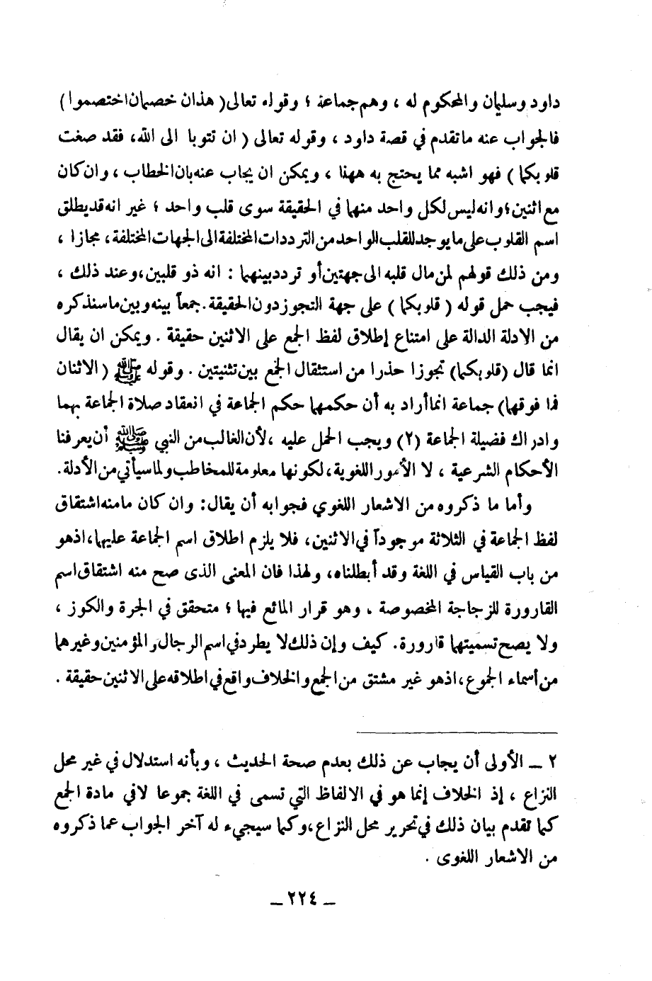 دَاوُدُ وَسُلَيْمَانُ وَالْمَحْكُومُ لَهُ وَهُمْ جَمَاعَةٌ، وَقَوْلُهُ تَعَالَى: {هَذَانِ خَصْمَانِ اخْتَصَمُوا} ، فَالْجَوَابُ عَنْهُ مَا تَقَدَّمَ فِي قِصَّةِ دَاوُدَ، وَقَوْلُهُ تَعَالَى: {إِنْ تَتُوبَا إِلَى اللَّهِ فَقَدْ صَغَتْ قُلُوبُكُمَا} فَهُوَ أَشْبَهُ مِمَّا يُحْتَجُّ بِهِ هَاهُنَا وَيُمْكِنُ أَنْ يُجَابَ عَنْهُ بِأَنَّ الْخِطَابَ وَإِنْ كَانَ مَعَ اثْنَيْنِ، وَإِنَّهُ لَيْسَ لِكُلِّ وَاحِدٍ مِنْهُمَا فِي الْحَقِيقَةِ سِوَى قَلْبٍ وَاحِدٍ غَيْرَ أَنَّهُ قَدْ يُطْلَقُ اسْمُ الْقُلُوبِ عَلَى مَا يُوجَدُ لِلْقَلْبِ الْوَاحِدِ مِنَ التَّرَدُّدَاتِ الْمُخْتَلِفَةِ إِلَى الْجِهَاتِ الْمُخْتَلِفَةِ مَجَازًا، وَمِنْ ذَلِكَ قَوْلُهُمْ لِمَنْ مَالَ قَلْبُهُ إِلَى جِهَتَيْنِ أَوْ تَرَدَّدَ بَيْنَهُمَا: إِنَّهُ ذُو قَلْبَيْنِ وَعِنْدَ ذَلِكَ فَيَجِبُ حَمْلُ قَوْلِهِ: {قُلُوبُكُمَا} عَلَى جِهَةِ التَّجَوُّزِ دُونَ الْحَقِيقَةِ، جَمْعًا بَيْنَهُ وَبَيْنَ مَا سَنَذْكُرُهُ مِنَ الْأَدِلَّةِ الدَّالَّةِ عَلَى امْتِنَاعِ إِطْلَاقِ لَفْظِ الْجَمْعِ عَلَى الِاثْنَيْنِ حَقِيقَةً، وَيُمْكِنُ أَنْ يُقَالَ: إِنَّمَا قَالَ: {قُلُوبُكُمَا} تَجَوُّزًا حَذَرًا مِنِ اسْتِثْقَالِ الْجَمْعِ بَيْنَ تَثْنِيَتَيْنِ.