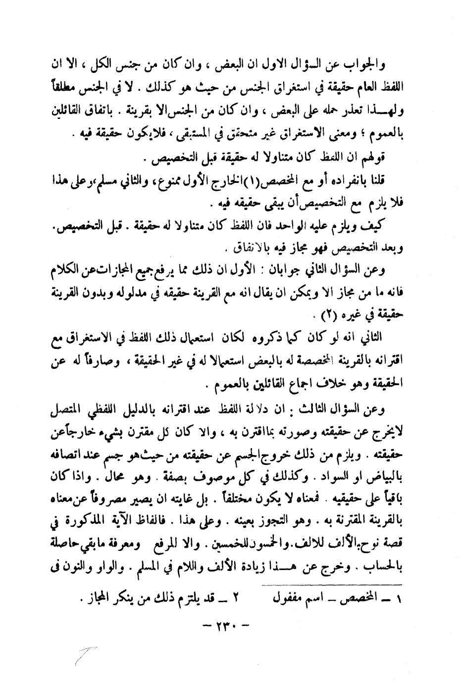 وَعَنِ السُّؤَالِ الثَّانِي جَوَابَانِ: الْأَوَّلُ: أَنَّ ذَلِكَ مِمَّا يَرْفَعُ جَمِيعَ الْمَجَازَاتِ عَنِ الْكَلَامِ، فَإِنَّهُ مَا مِنْ مَجَازٍ إِلَّا وَيُمْكِنُ أَنْ يُقَالَ: إِنَّهُ مَعَ الْقَرِينَةِ حَقِيقَةٌ فِي مَدْلُولِهِ، وَبِدُونِ الْقَرِينَةِ حَقِيقَةٌ فِي غَيْرِهِ (٢) .