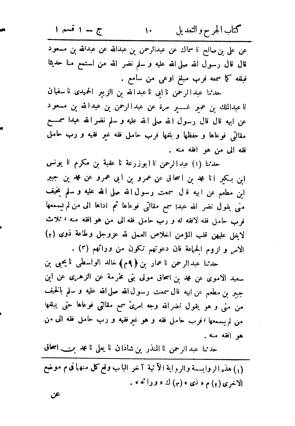 حَدثنا عَبد الرَّحمن، حَدثنا عمار بن خالد الواسطي، حَدثنا يَحيَى بن سَعيد الأُمَوي عن محمد بن إِسحاق مولى بني مخرمة عن الزُّهْري، عَن ابن جُبَير بن مُطْعِم، عَن أَبيه، قال: سَمِعتُ رسول الله صَلى الله عَليه وسَلم بالخيف من مِنًى، وهو يقول نضر الله وجه امرئ سمع مقالتي فوعاها حتى يبلغها من لم يسمعها، فرب حامل فقه، وهو غير فقيه ورب حامل فقه إلى من هو أفقه منه.