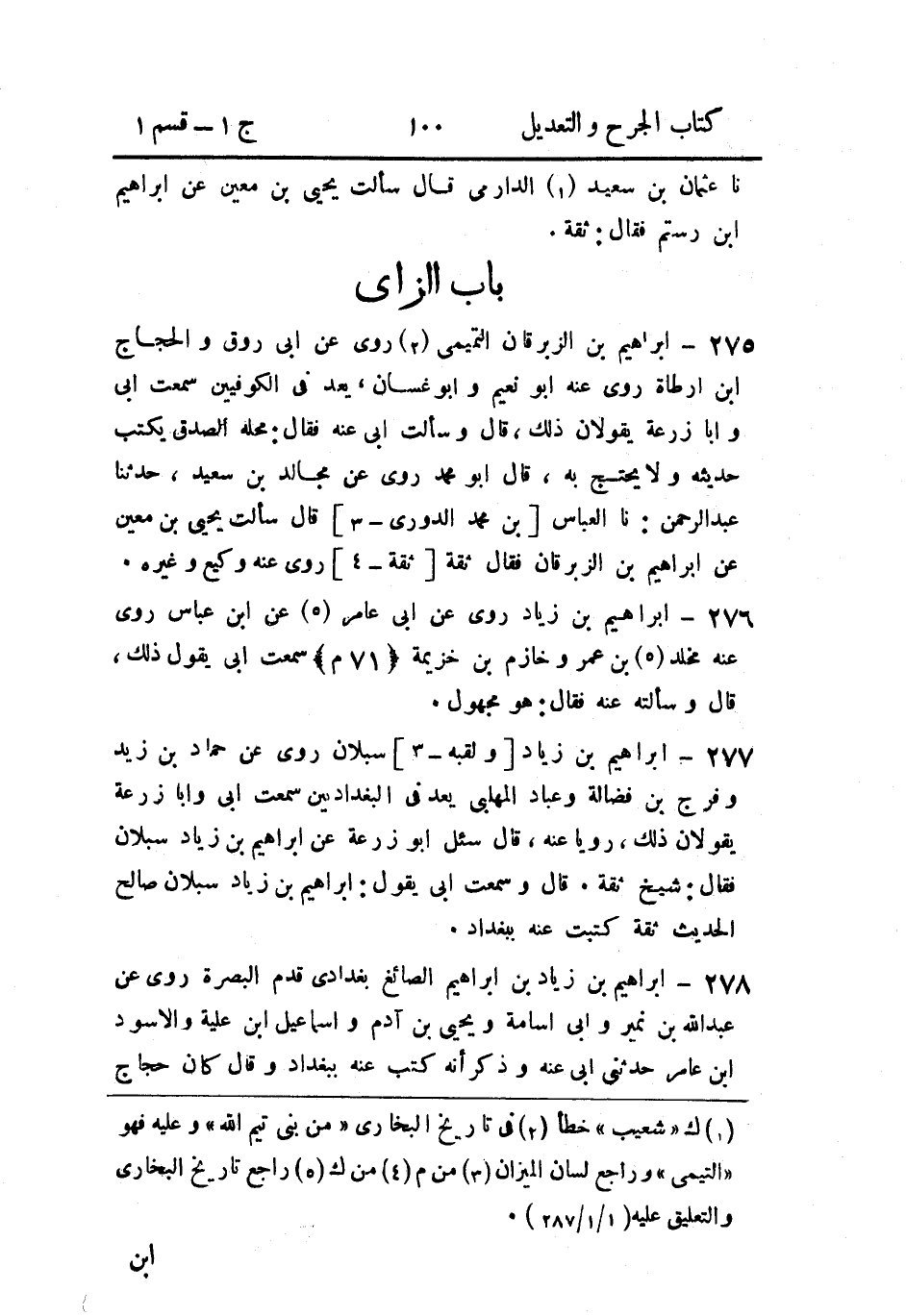 حَدثنا عَبد الرَّحمن: حَدثنا العباس بن محمد الدُّوري، قال: سأَلتُ يَحيَى بن مَعين، عن إِبراهيم بن الزبرقان؟ فَقال: ثِقةٌ ثقة، رَوَى عَنه وكيع، وغيره.