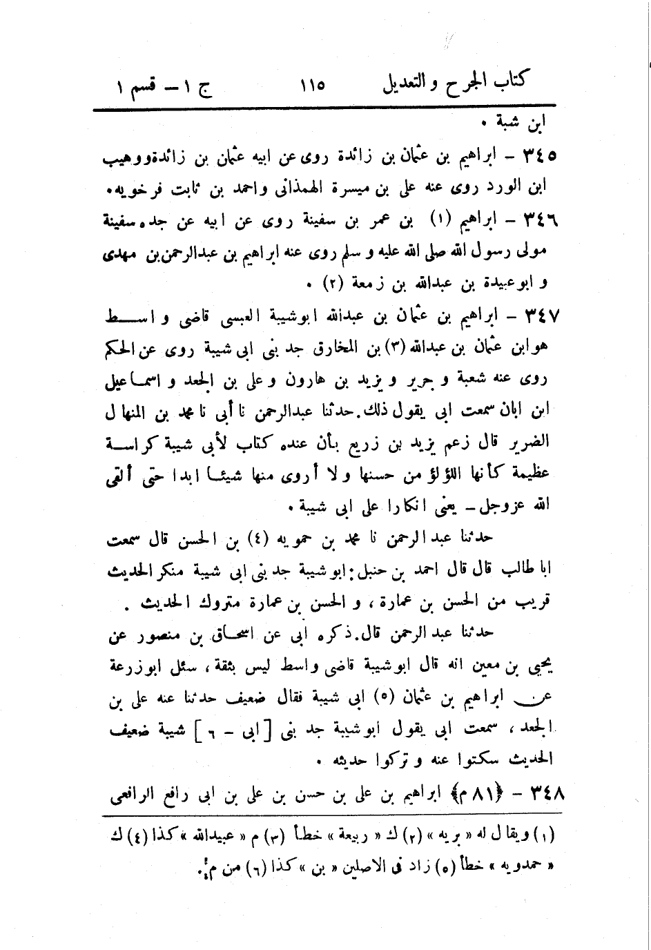 حَدثنا عَبد الرَّحمن، حَدثنا أَبي، حَدثنا محمد بن المنهال الضرير، قال: زعم يزيد بن زريع بأن عنده كتاب لأَبي شَيبة، كراسة عظيمة، كأَنها اللؤلؤ من حسنها، ولا أروي منها شيئا أبدا حتى ألقى الله عز وجل، يعني إنكارا على أَبي شَيبة.
