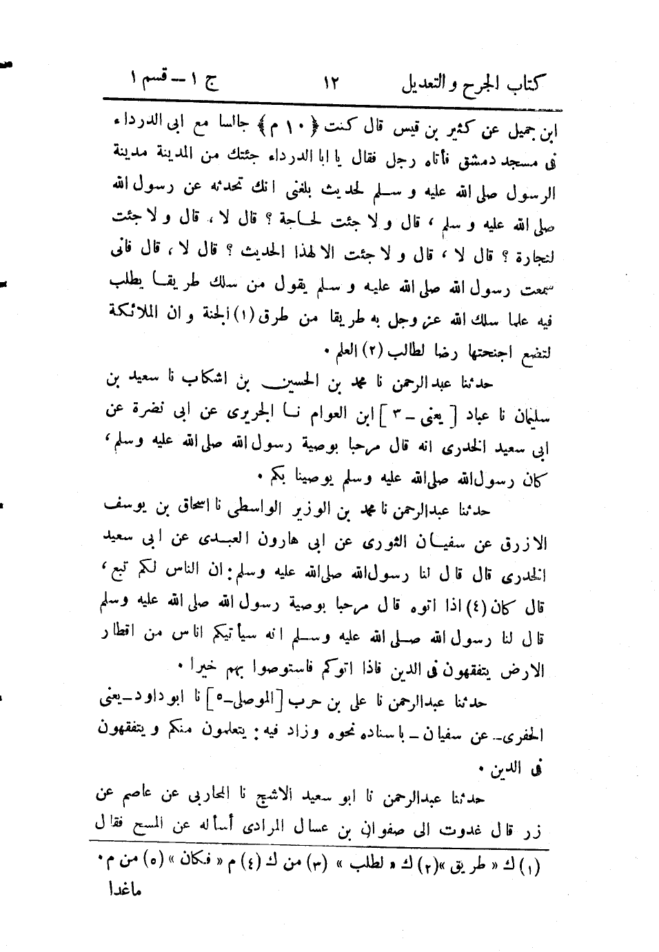 حَدثنا عَبد الرَّحمن، حَدثنا أَبو سَعيد الأَشج، حَدثنا المحاربي عن عاصم عن زر قال غدوت إلى صفوان بن عسال المرادي أسأله عن المسح فقال: ما غدا بك يا زر؟ قلت: غدوت أطلب العلم، قال: أما أَنّي سمعت رسول الله صَلى الله عَليه وسَلم يقول: من غدا يطلب مثل ما طلبت فرشت له الملائكة أجنحتها رضا بالذي يصنع.