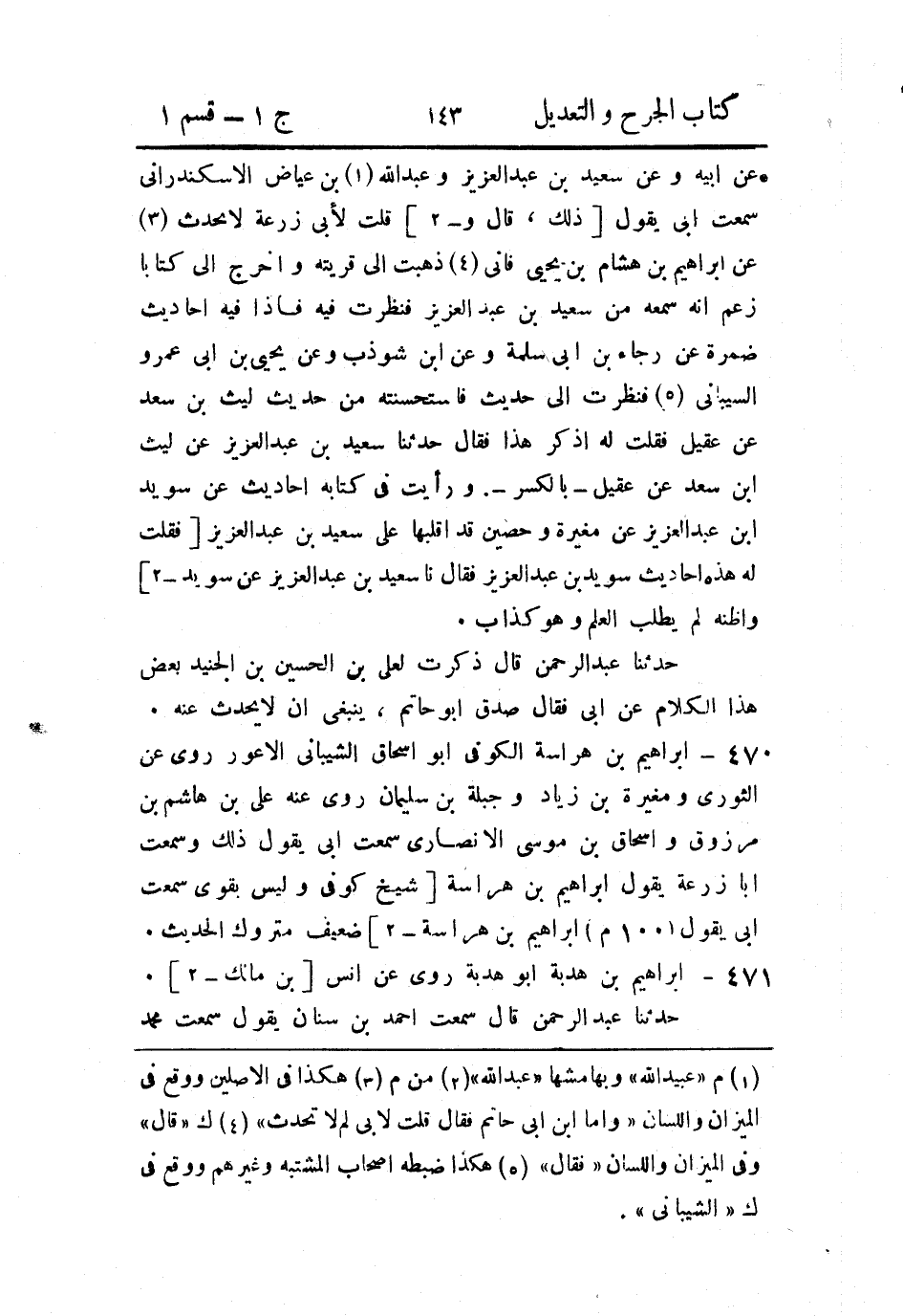 سَمِعتُ أَبي يقول ذلك، قال: وقلت لأَبي زُرعَة: لا تحدث عن إِبراهيم بن هشام بن يحيى، فإِني ذهبت إلى قريته، وأخرج إلىَّ كتابًا زعم أَنه سمعه من سَعيد بن عَبد العزيز، فنظرت فيه فإذا فيه أحاديث ضمرة، عن رجاء بن أَبي سلمة، وعن ابن شوذب، وعن يَحيَى بن أَبي عَمرو السيباني، فنظرت إلى حديث فاستحسنته من حديث ليث بن سعد عن عقيل، فقلتُ له: أذكر هذا، فقال: حَدثنا سَعيد بن عَبد العزيز، عن ليث بن سعد، عن عقيل، بالكسر، ورأيت في كتابه أحاديث عن سُويد بن عَبد العزيز، عن مغيرة، وحصين، قد أقلبها على سَعيد بن عَبد العزيز، فقلتُ له: هذه أحاديث سُويد بن عَبد العزيز، فقال: حَدثنا سَعيد بن عَبد العزيز، عن سويد، وأظنه لم يطلب العلم، وهو كذاب.