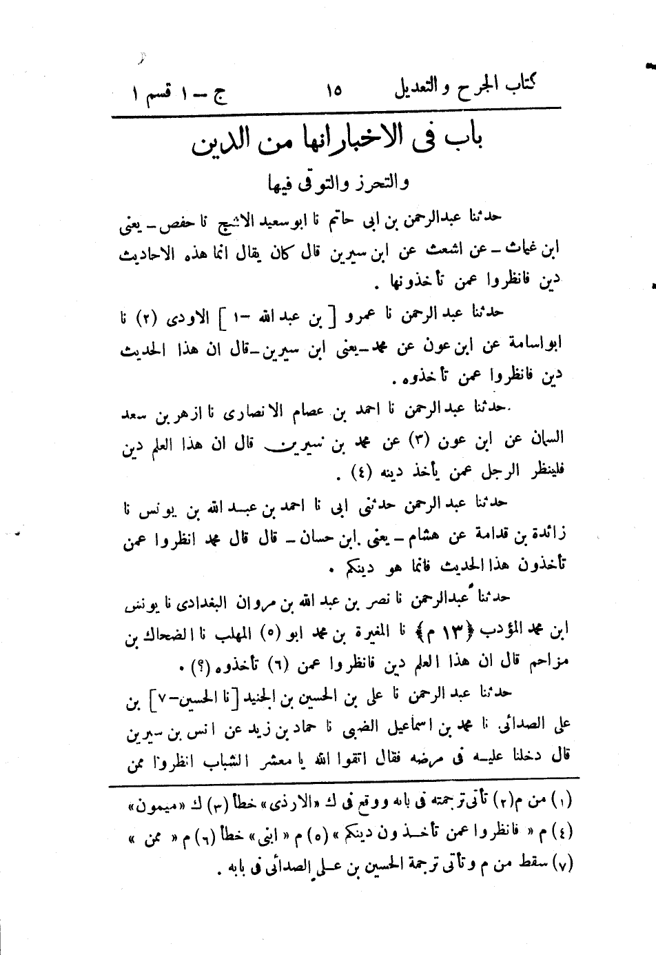 حَدثنا عَبد الرَّحمن، حَدثنا عَلي بن الحسين بن الجنيد، حَدثنا الحسين بن علي الصدائي، حَدثنا محمد بن إِسماعيل الضبي، حَدثنا حماد بن زَيد، عَن أَنَس بن سيرين قال دخلنا عليه في مرضه فقال إتقوا الله يا معشر الشباب أنظروا ممن تأخذون هذه الأحاديث فإِنها من دينكم.