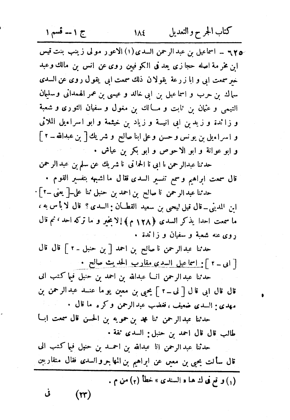 حَدثنا عَبد الرَّحمن، أَخبَرنا عَبد الله بن أَحمد بن حَنبل، فيما كَتَبَ إلَيَّ، قال: قال أَبي: قال لي يَحيَى بن مَعين يوما عند عَبد الرَّحمن بن مهدي: السدي ضعيف، فغضب عَبد الرَّحمن وكره ما قال.