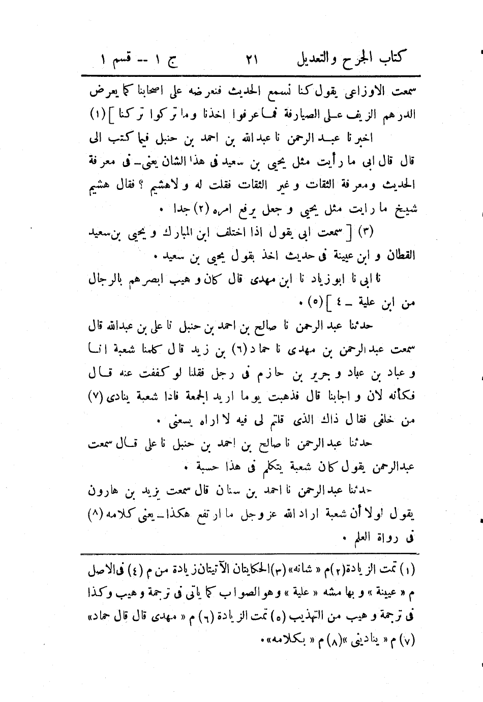 حَدثنا عَبد الرَّحمن، حَدثنا صالح بن أَحمد بن حَنبل، حَدثنا علي، قال: سَمِعتُ عَبد الرَّحمن يقول كان شُعبة يتكلم في هذا حسبة.