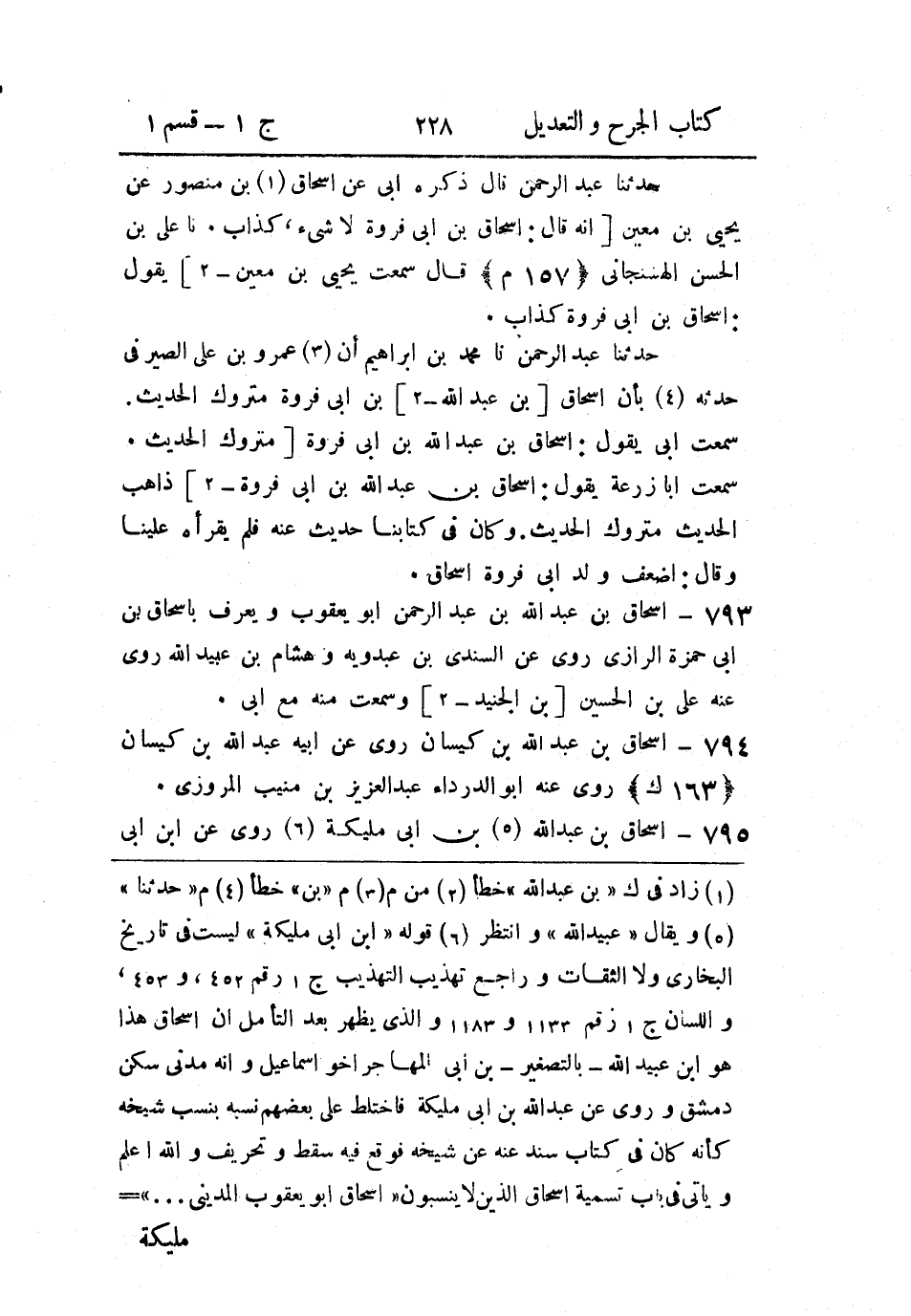 حَدثنا عَلي بن الحسن الهِسِنجَاني، قال: سَمِعتُ يَحيَى بن مَعين يقول: إِسحاق بن أَبي فروة كذاب.