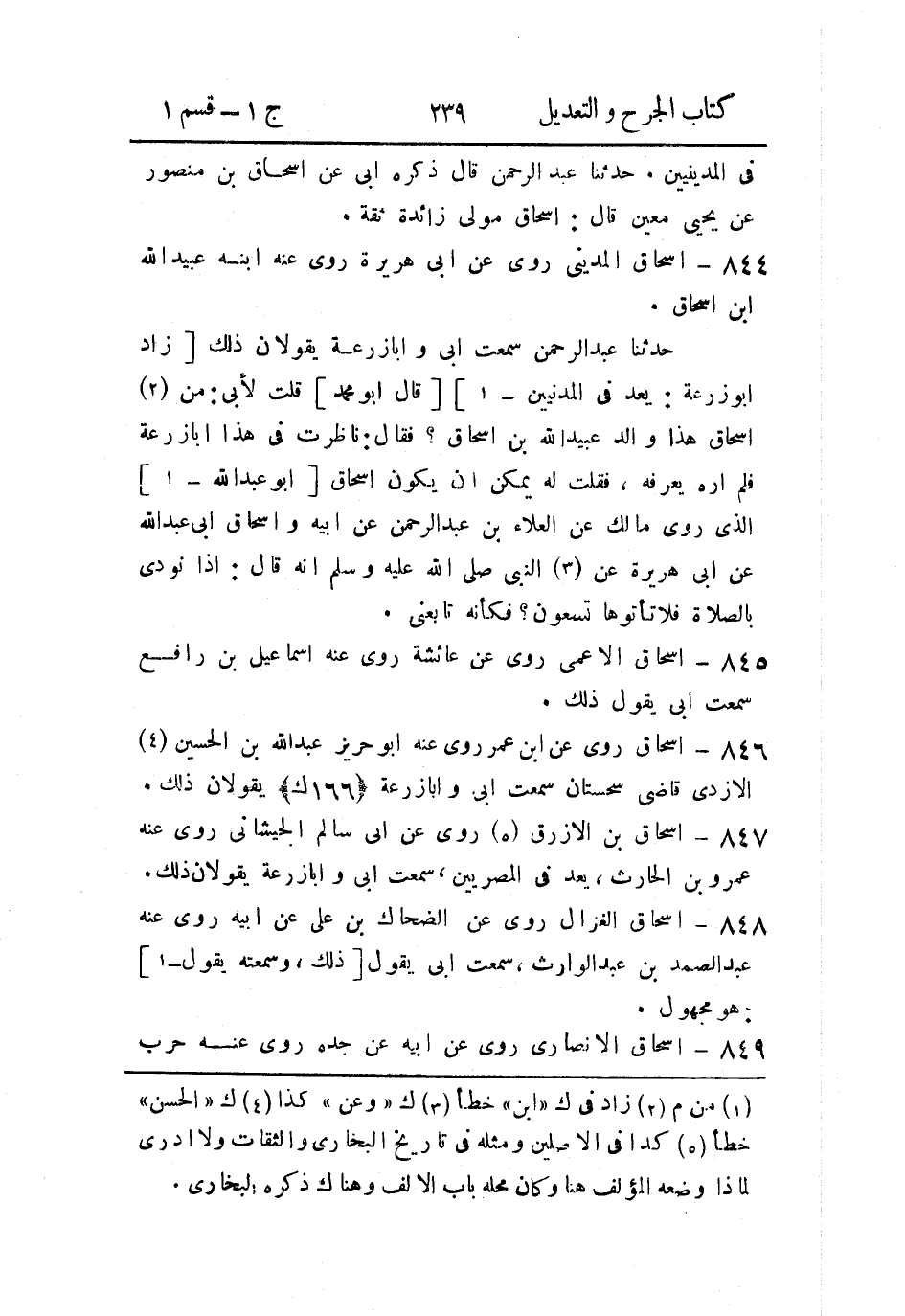 ُقَال أَبو محمد: قلتُ لأبي: مَنْ إِسحاق هذا والد عُبَيد الله بن إِسحاق؟ فقال: ناظرت في هذا أَبا زُرعَة، فلم أره يعرفه، فقلتُ له: يمكن أَن يكون إِسحاق أَبو عَبد الله، الذي روى مالك عن العلاء بن عَبد الرَّحمن، عَن أَبيه، وإِسحاق أبي عَبد الله، عَن أَبي هُرَيرة، عن النَّبي صَلى الله عَليه وسَلم، أَنه قال: إِذا نودي بالصلاة فلا تأتوها تسعون، فكأَنه تابعني.