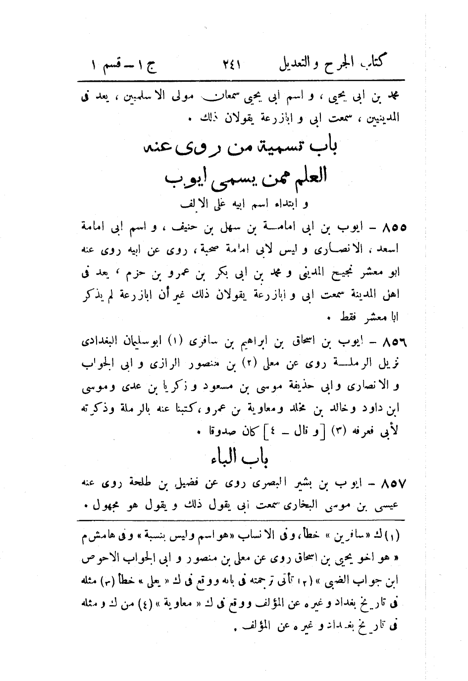 - باب تسمية من رُوي عنه العلم، مِمَّن يُسَمَّى أَيوب، وابتداء اسم أَبيه على الألف.