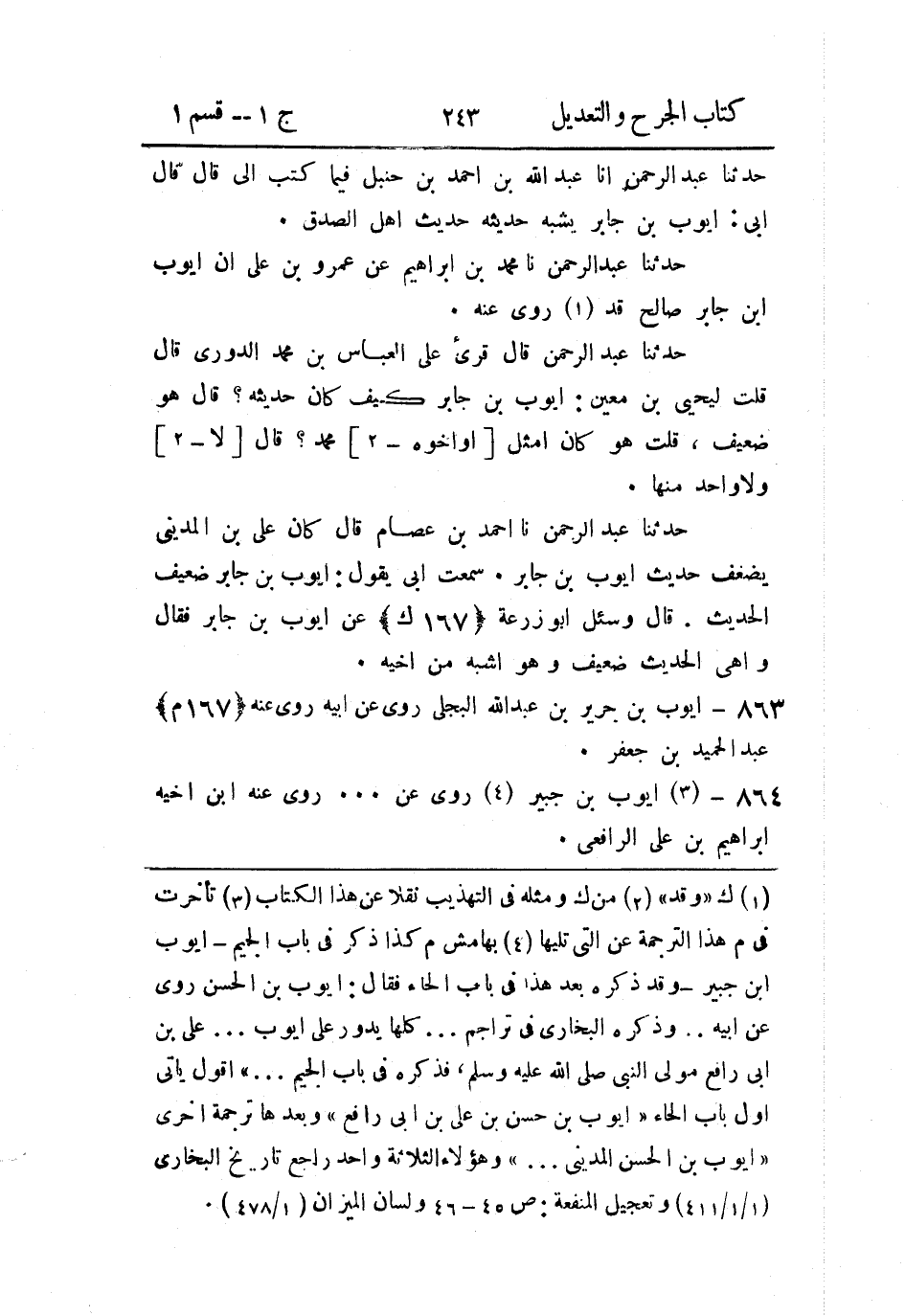 حَدثنا عَبد الرَّحمن، قال: قُرِئَ عَلَى العباس بن محمد الدُّوري، قال: قلتُ ليحيى بن مَعين: أَيوب بن جابر، كيف كان حديثه؟ قال: هُو ضعيف، قلت: هو كان أمثل، أَو أخوه محمد؟ قال: لا، ولا واحد منها.
