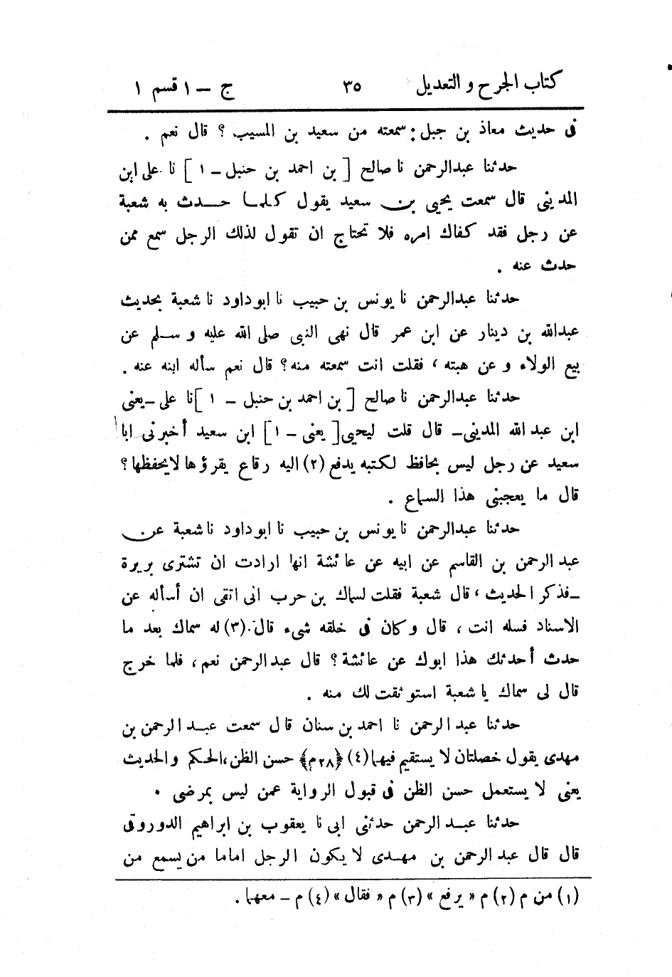 حَدثنا عَبد الرَّحمن، حَدثنا أَحمد بن سنان، قال: سَمِعتُ عَبد الرَّحمن بن مهدي يقول خصلتان لا يستقيم فيهما حسن الظن، الحكم والحديث، يَعني لا يستعمل حسن الظن في قبول الرواية عمن ليس بمرضي.