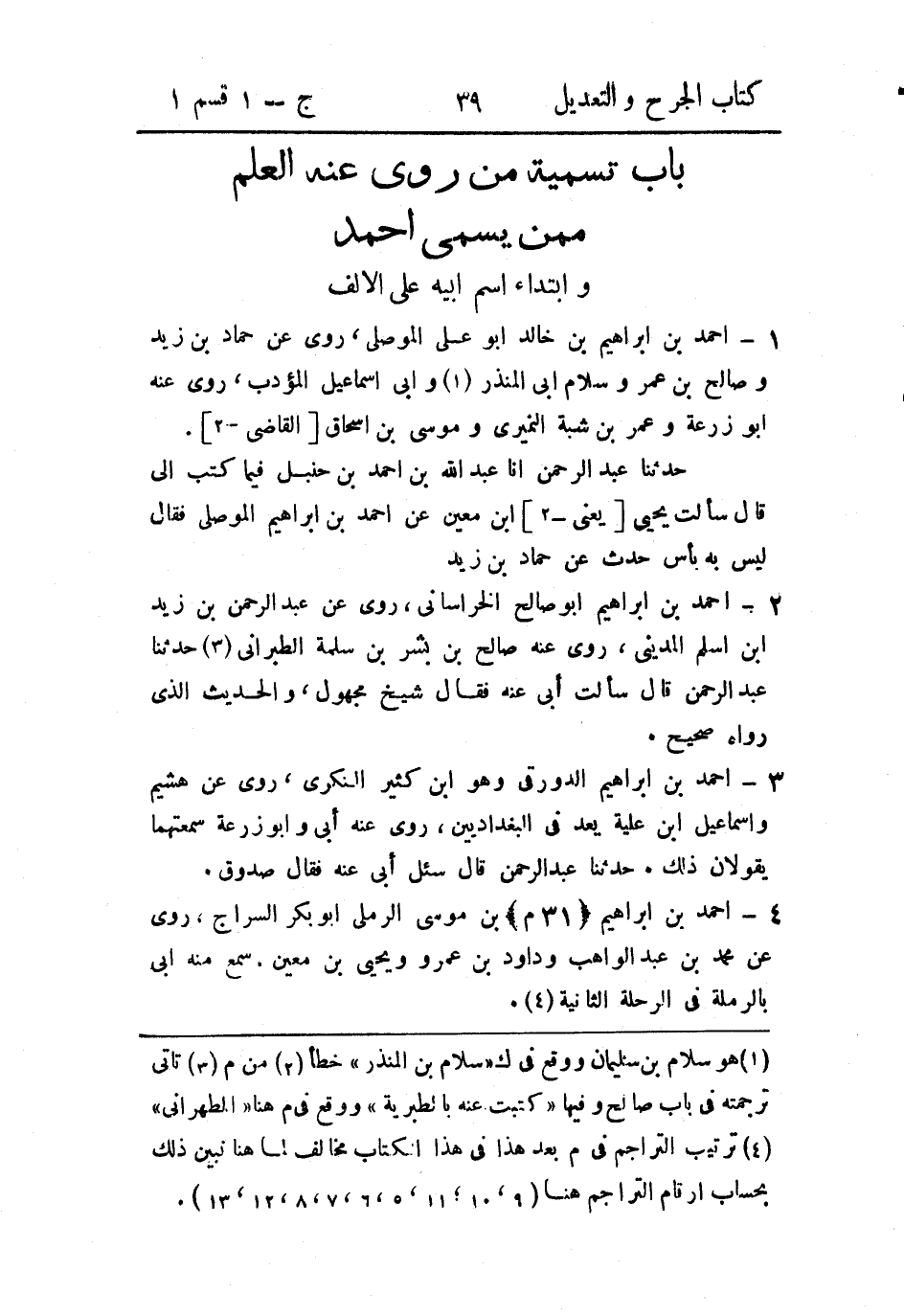 - باب تسمية من رُوي عنه العلم، مِمَّن يُسَمَّى أَحمد، وابتداء اسم أَبيه على الألف.