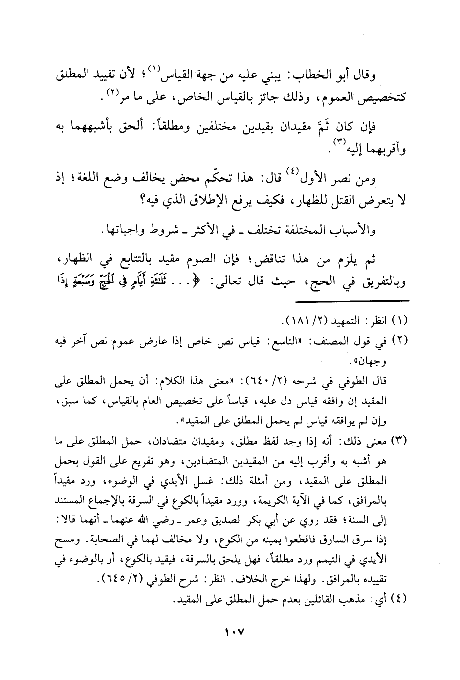 3 معنى ذلك: أنه إذا وجد لفظ مطلق، ومقيدان متضادان، حمل المطلق على ما هو أشبه به وأقرب إليه من المقيدين المتضادين، وهو تفريع على القول بحمل المطلق على المقيد، ومن أمثلة ذلك: غسل الأيدي في الوضوء، ورد مقيدًا بالمرافق، كما في الآية الكريمة، وورد مقيدًا بالكوع في السرقة بالإجماع المستند إلى السنة، فقد روي عن أبي بكر الصديق وعمر -رضي الله عنهما- أنهما قالا: إذا سرق السارق فاقطعوا يمينه من الكوع، ولا مخالف لهما في الصحابة. ومسح الأيدي في التيمم ورد مطلقًا، فهل يلحق بالسرقة، فيقيد بالكوع، أو بالوضوء في تقييده بالمرافق. ولهذا خرج الخلاف انظر شرح الطوفي "2/ 645".