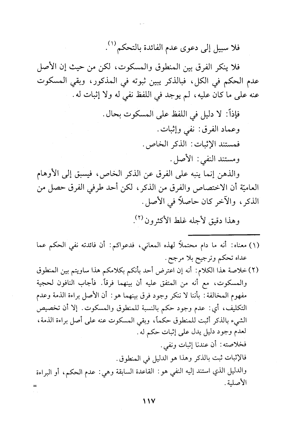 2 خلاصة هذا الكلام: أنه إن اعترض أحد بأنكم بكلامكم هذا ساويتم بين المنطوق والمسكوت، مع أنه من المتفق عليه أن بينهما فرقًا. فأجاب النافون لحجية مفهوم التكليف، أي: عدم وجود حكم بالنسبة للمنطوق والمسكوت. إلا أن تخصيص الشيء بالذكر أثبت للمنطوق حكمًا، وبقي المسكوت عنه على أصل براءة الذمة، لعدم وجود دليل يدل على إثبات حكم له.