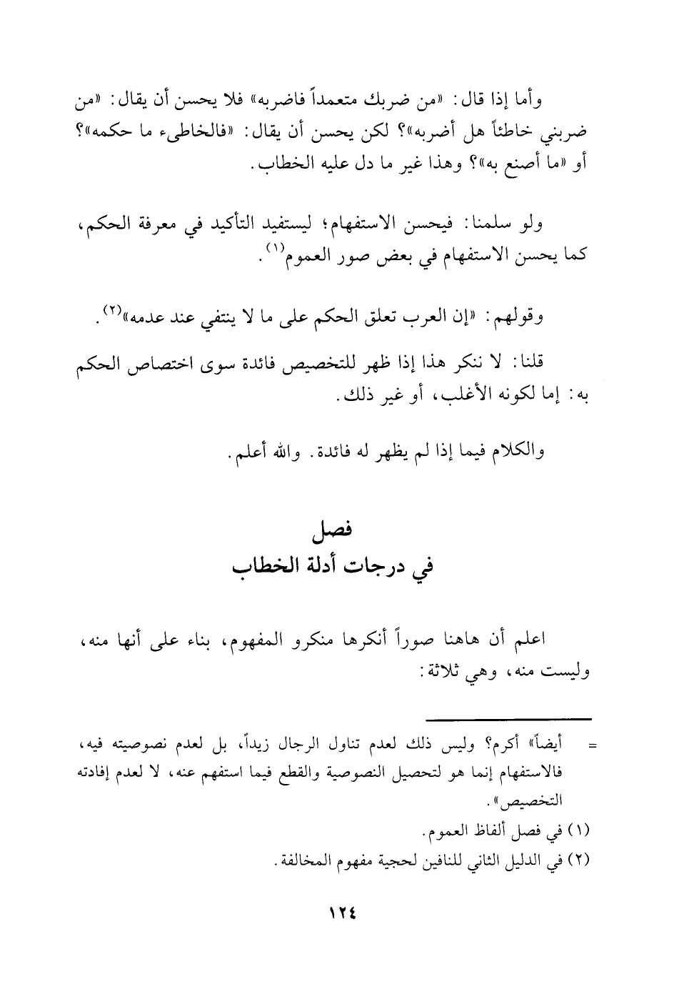 وأما إذا قال: "من ضربك متعمدًا فاضربه" فلا يحسن أن يقال: "من ضربني خاطئًا، هل أضربه؟ " لكن يحسن أن يقال: "فالخاطئ ما حكمه"؟