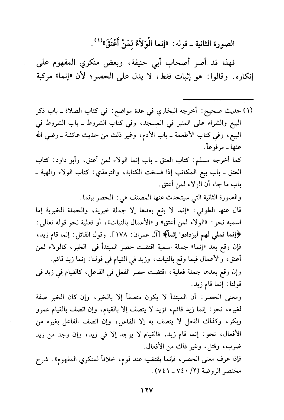 قال عنها الطوفي: "إنما: لا يقع بعدها إلا جملة خبرية، والجملة الخبرية إما اسمية نحو: "الولاء لمن أعتق" و"الأعمال بالنيات"، أو فعلية نحو قوله تعالى: {إِنَّمَا نُمْلِي لَهُمْ لِيَزْدَادُوا إِثْمًا} [آل عمران: 178] . وقول القائل: إنما قام زيد، فإن وقع بعد "إنما" جملة اسمية اقتضت حصر المبتدأ في الخبر، كالولاء لمن أعتق، والأعمال فيما وقع بالنيات، وزيد في القيام في قولنا: إنما زيد قائم.