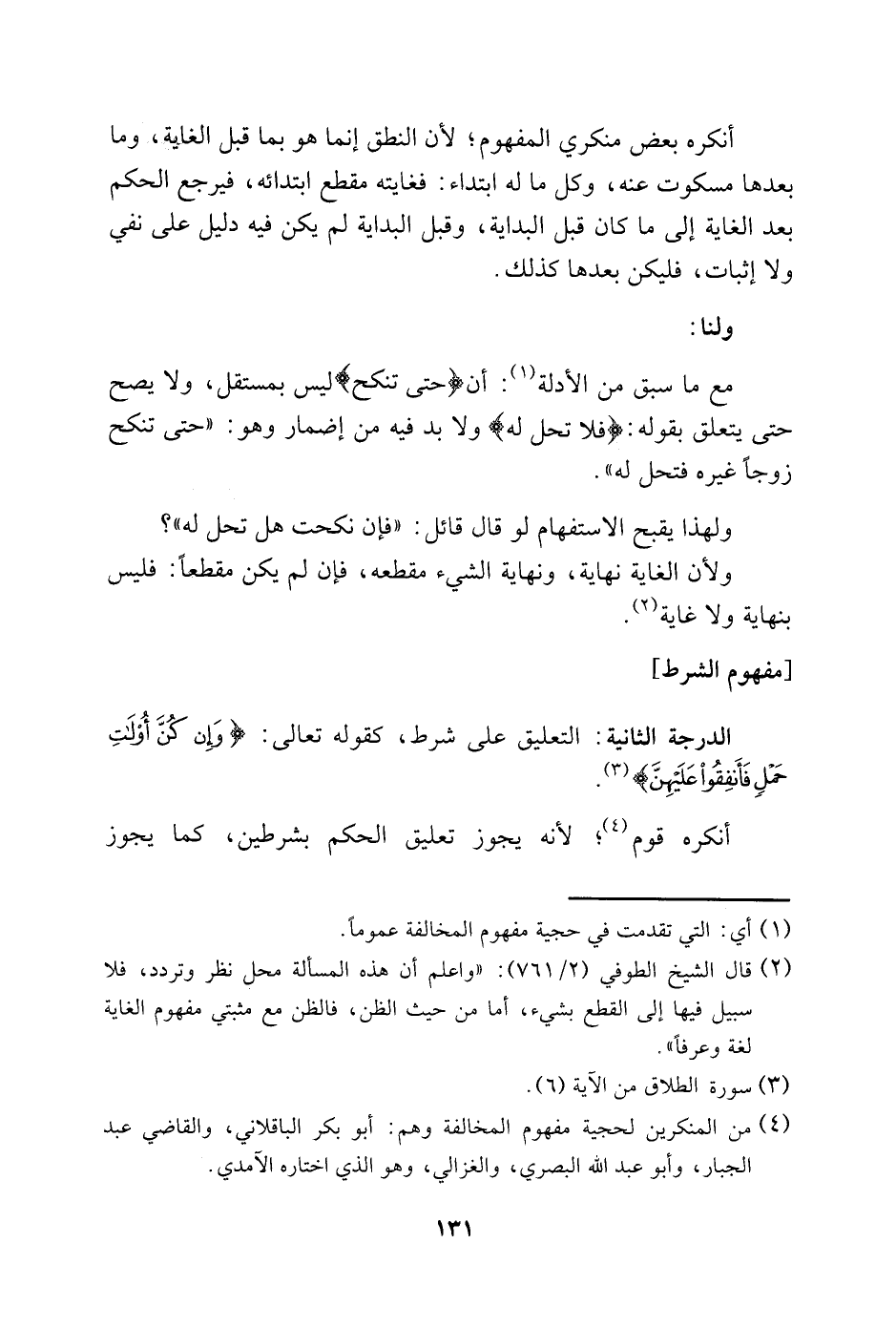 4 من المنكرين لحجية مفهوم المخالفة وهم: أبو بكر الباقلاني، والقاضي عبد الجبار، وأبو عبد الله البصري، والغزالي، وهو الذي اختاره الآمدي.