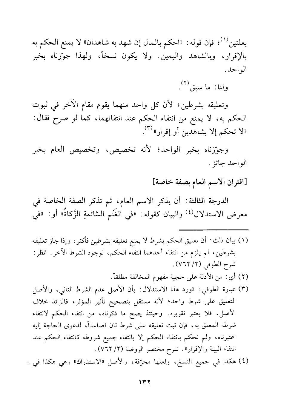 3 عبارة الطوفي: "ورد هذا الاستدلال: بأن الأصل عدم الشرط الثاني، والأصل التعليق على شرط واحد؛ لأنه مستقل بتصحيح تأثير المؤثر، فالزائد خلال الأصل، فلا يعتبر تقريره. وحينئذ يصح ما ذكرناه، من انتفاء الحكم لانتفاء شرطه المعلق به، فإن ثبت تعليقه على شرط ثان فصاعدًا، لدعوى الحاجة إليه اعتبرناه، ولم نحكم بانتفاء الحكم إلا بانتفاء جميع شروطه كانتفاء الحكم عند انتفاء البينة والإقرار". شرح مختصر الروضة "2/ 762".