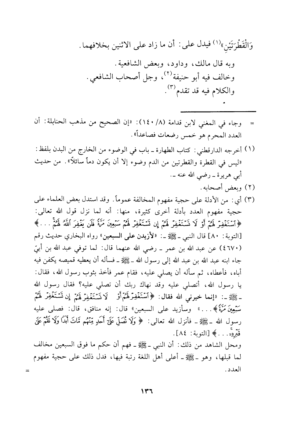 3 أي: من الأدلة على حجية المخالفة عمومًا. وقد استدل بعض العلماء على حجية مفهوم العدد بأدلة أخرى كثيرة، منها: أنه لما نزل قول الله تعالى: {اسْتَغْفِرْ لَهُمْ أَوْ لَا تَسْتَغْفِرْ لَهُمْ إِنْ تَسْتَغْفِرْ لَهُمْ سَبْعِينَ مَرَّةً فَلَنْ يَغْفِرَ اللَّهُ لَهُمْ ... } [التوبة: 80] قال النبي، صَلّى الله عَلَيْهِ وَسَلّم: "لأزيدن على السبعين" رواه البخاري حديث رقم "4670" عن عبد الله بن عمر -رضي الله عنهما- قال: لما توفي عبد الله بن أُبيّ جاء ابنه عبد الله بن عبد الله إلى رسول الله -صَلّى الله عَلَيْهِ وَسَلّم- فسأله أن يعطيه قميصه يكفن فيه أباه، فأعطاه، ثم سأله أن يصلي عليه، فقام عمر فأخذ بثوب رسول الله، صَلّى الله عَلَيْهِ وَسَلّم، فقال: يا رسول الله، أتصلي عليه وقد نهاك ربك أن تصلي عليه؟ فقال رسول الله، صَلّى الله عَلَيْهِ وَسَلّم: "إنما خيرني الله فقال: {اسْتَغْفِرْ لَهُمْ أَوْ لا تَسْتَغْفِرْ لَهُمْ إِنْ تَسْتَغْفِرْ لَهُمْ سَبْعِينَ مَرَّةً} وسأزيد على السبعين" قال: إنه منافق، قال: فصلى عليه رسول الله -صَلّى الله عَلَيْهِ وَسَلّم- فأنزل الله تعالى: {وَلا تُصَلِّ عَلَى أَحَدٍ مِنْهُمْ مَاتَ أَبَدًا وَلا تَقُمْ عَلَى قَبْرِهِ} [التوبة: 84] .