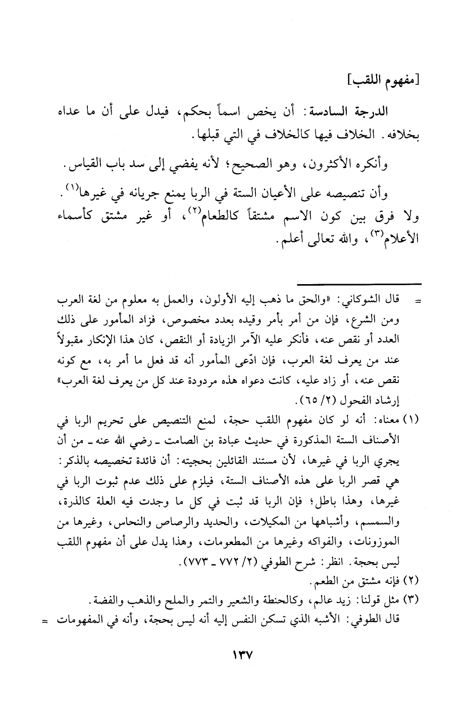 1 معناه: أنه لو كان مفهوم اللقب حجة، لمنع التنصيص على تحريم الربا في الأصناف الستة المذكورة في حديث عبادة بن الصامت -رضي الله عنه- من أن يجري الربا في غيرها، لأن مستند القائلين بحجيته: أن فائدة تخصيصه بالذكر: هي قصر الربا على هذه الأصناف الستة، فيلزم على ذلك عدم ثبوت الربا في غيرها وهذا باطل، فإن الربا قد ثبت في كل ما وجدت فيه العلة كالذرة، والسمسم، وأشباهها من المكيلات، والحديد والرصاص والنحاس، وغيرها من الموزونات، والفواكه وغيرها من المطعومات، وهذا يدل على أن مفهوم اللقب ليس بحجة. انظر: شرح الطوفي "2/ 772-773".