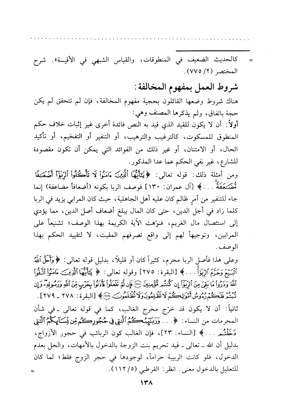 ومن أمثلة ذلك قوله تعالى: {يَا أَيُّهَا الَّذِينَ آمَنُوا لا تَأْكُلُوا الرِّبا أَضْعَافًا مُضَاعَفَةً....} [آل عمران: 130] فوصف الربا بكونه "أضعافًا مضاعفة" إن جاء للتنفير من أمر ظالم كان عليه أهل الجاهلية، حيث كان المرابي يزيد في الربا كلما زاد في أجل الدين، حتى كان المال يبلغ أضعاف أصل الدين، مما يؤدي إلى استئصال مال الغريم، فنوهت الآية الكريمة بهذا الوصف، تشنيعًا على المرابين، وتوجيهًا لهم إلى واقع تصرفهم المقيت، لا لتقييد الحكم بهذا الوصف.