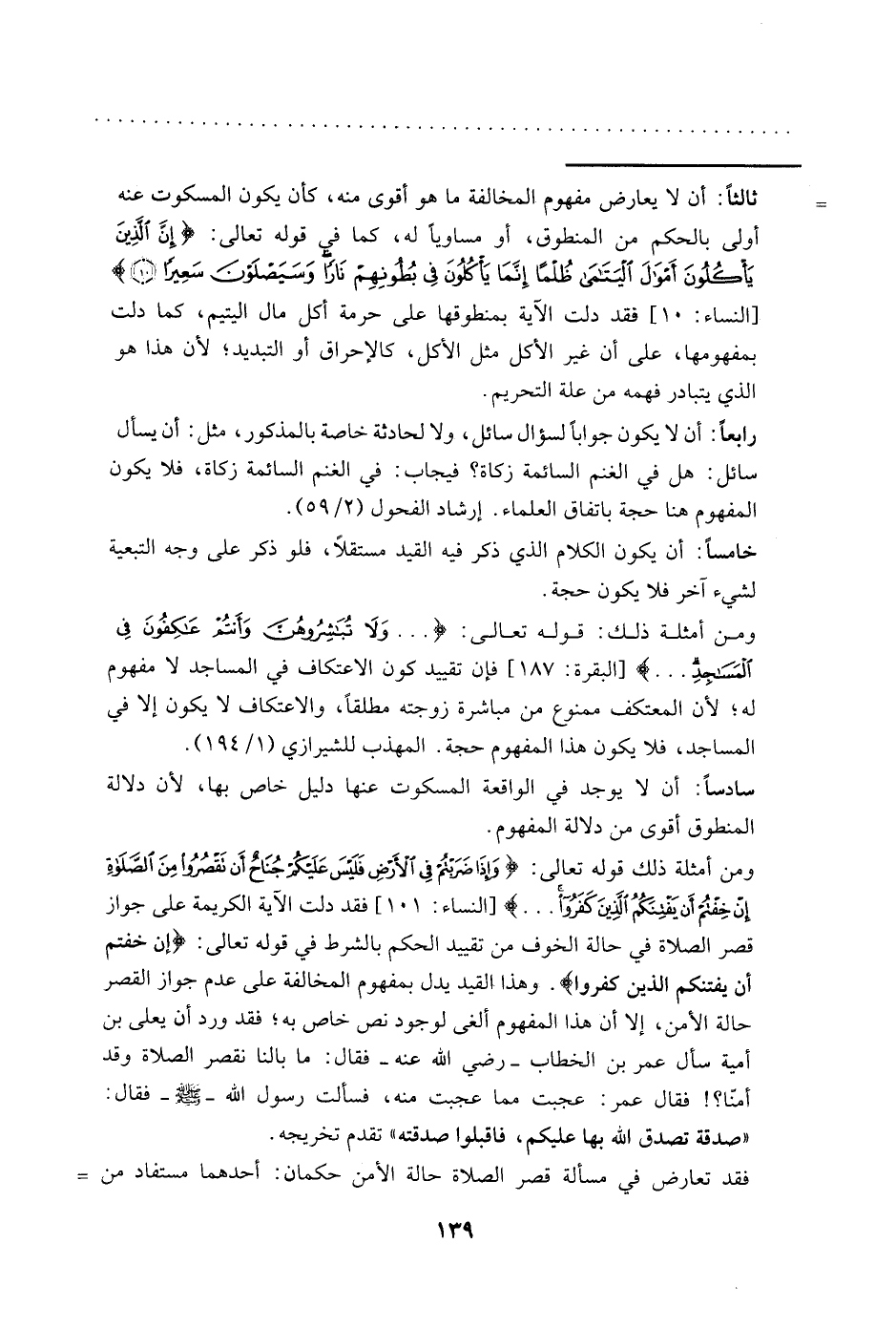 = ثالثًا: أن لا يعارض مفهوم المخالفة ما هو أقوى منه، كأن يكون المسكوت عنه أولى بالحكم من المنطوق، أو مساويًا له، كما في قوله تعالى: {إِنَّ الَّذِينَ يَأْكُلُونَ أَمْوَالَ الْيَتَامَى ظُلْمًا إِنَّمَا يَأْكُلُونَ فِي بُطُونِهِمْ نَارًا وَسَيَصْلَوْنَ سَعِيرًا} [النساء: 10] فقد دلت الآية بمنطوقها على حرمة أكل مال اليتيم، كما دلت بمفهومهما، على أن غير الأكل مثل الأكل، كالإحراق أو التبديد، لأن هذا هو الذي يتبادر فهمه من علة التحريم.