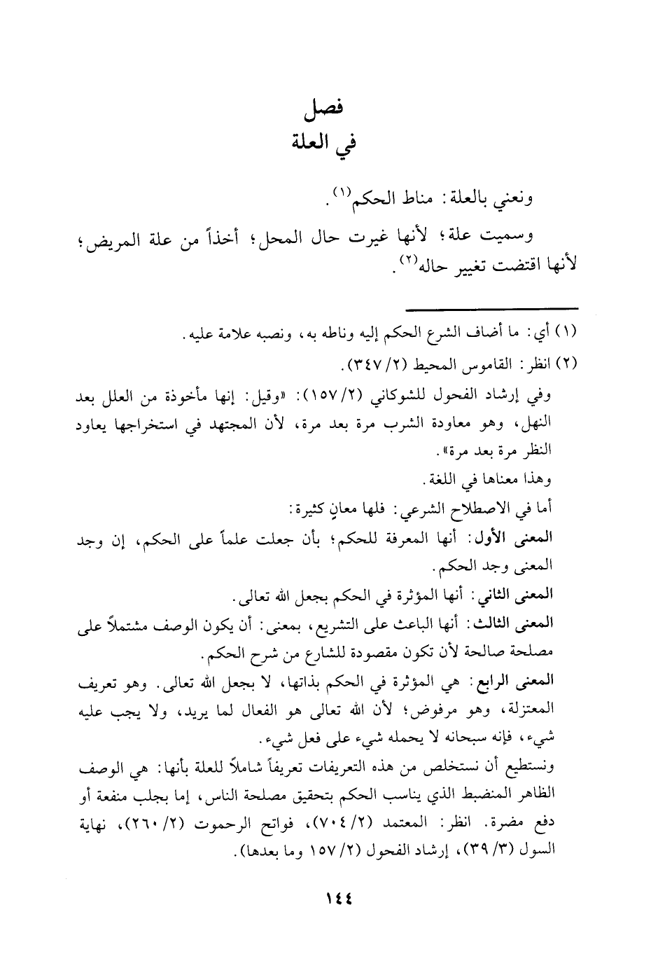 ونستطيع أن نستخلص من هذه التعريفات تعريفًا شاملًا للعلة بأنها: هي الوصف الظاهر المنضبط الذي يناسب الحكم بتحقيق مصلحة الناس، إما بجلب منفعة أو دفع مضرة. انظر: المعتمد "2/ 704"، فواتح الرحموت "2/ 260"، نهاية السول "3/ 39"، إرشاد الفحول "2/ 157 وما بعدها".