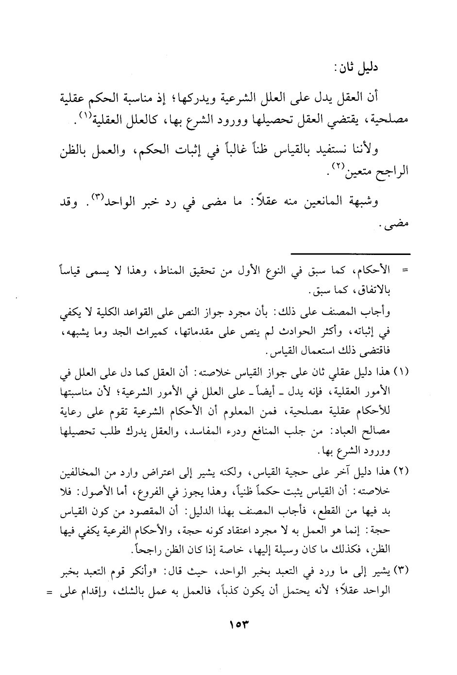 1 هذا دليل عقلي ثان على جواز القياس خلاصته: أن العقل كما دل على العلل في الأمور العقلية، فإنه يدل، أيضًا على العلل في الأمور الشرعية؛ لأن مناسبتها للأحكام عقلية مصلحية، فمن المعلوم أن الأحكام الشرعية تقوم على رعاية مصالح العباد: من جلب المنافع ودرء المفاسد، والعقل يدرك طلب تحصيلها وورود الشرع بها.