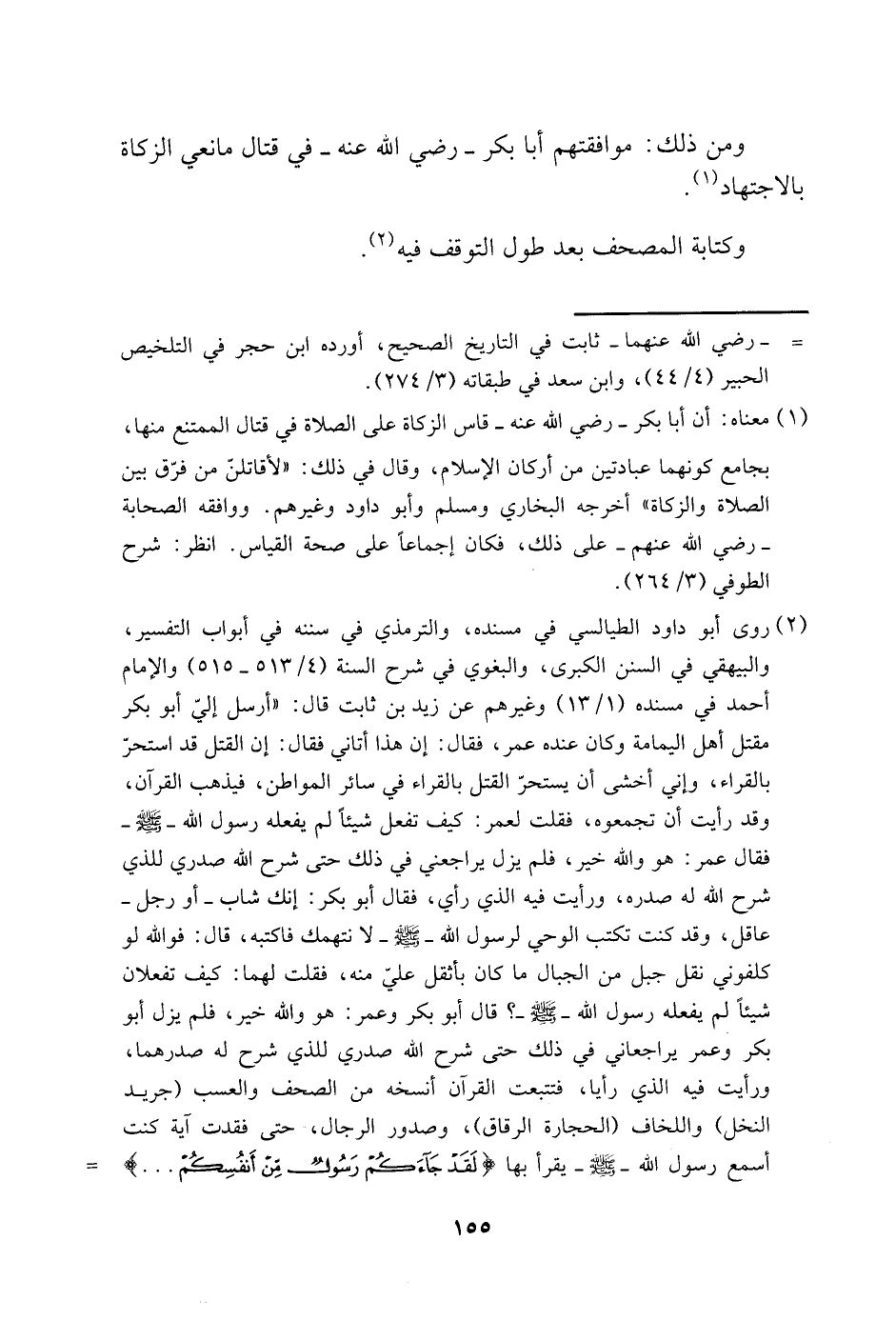 3 روى أبو داود الطيالسي في مسنده، والترمذي في سننه في أبواب التفسير، والبيهقي في السنن الكبرى، والبغوي في شرح السنة "4/ 513-515" والإمام أحمد في مسنده "1/ 13" وغيرهم عن زيد بن ثابت قال: "أرسل إليّ أبو بكر مقتل أهل اليمامة وكان عنده عمر، فقال: إن هذا أتاني فقال: إن القتل قد استحرّ بالقراء، وإني أخشى أن يستحرّ القتل بالقراء في سائر المواطن، فيذهب القرآن، وقد رأيت أن تجمعوه، فقلت لعمر: كيف تفعل شيئًا لم يفعله رسول الله -صَلّى الله عَلَيْهِ وَسَلّم- فقال عمر: هو والله خير، فلم يزل يراجعني في ذلك حتى شرح الله صدري للذي شرح الله له صدره، ورأيت فيه الذي رأى، فقال أبو بكر: إنك شاب -أو رجل- عاقل، وقد كنت تكتب الوحي لرسول الله -صَلّى الله عَلَيْهِ وَسَلّم- لا نتهمك فاكتبه، قال: فو الله لو كلفوني نقل جبل من الجبال ما كان بأثقل علي منه، فقلت لهما: كيف تفعلان شيئًا لم يفعله رسول الله، صَلّى الله عَلَيْهِ وَسَلّم؟ قال أبو بكر وعمر: هو والله خير، فلم يزل أبو بكر وعمر يراجعاني في ذلك حتى شرح الله صدري للذي شرح له صدرهما، ورأيت فيه الذي رأيا، فتتبعت القرآن أنسخه من الصحف والعسب "جريد النخل" واللخاف "الحجارة الرقاق"، وصدور الرجال، حتى فقدت آية كنت أسمع رسول الله -صَلّى الله عَلَيْهِ وَسَلّم- يقرأ بها {لَقَدْ جَاءَكُمْ رَسُولٌ مِنْ أَنْفُسِكُمْ ... } =