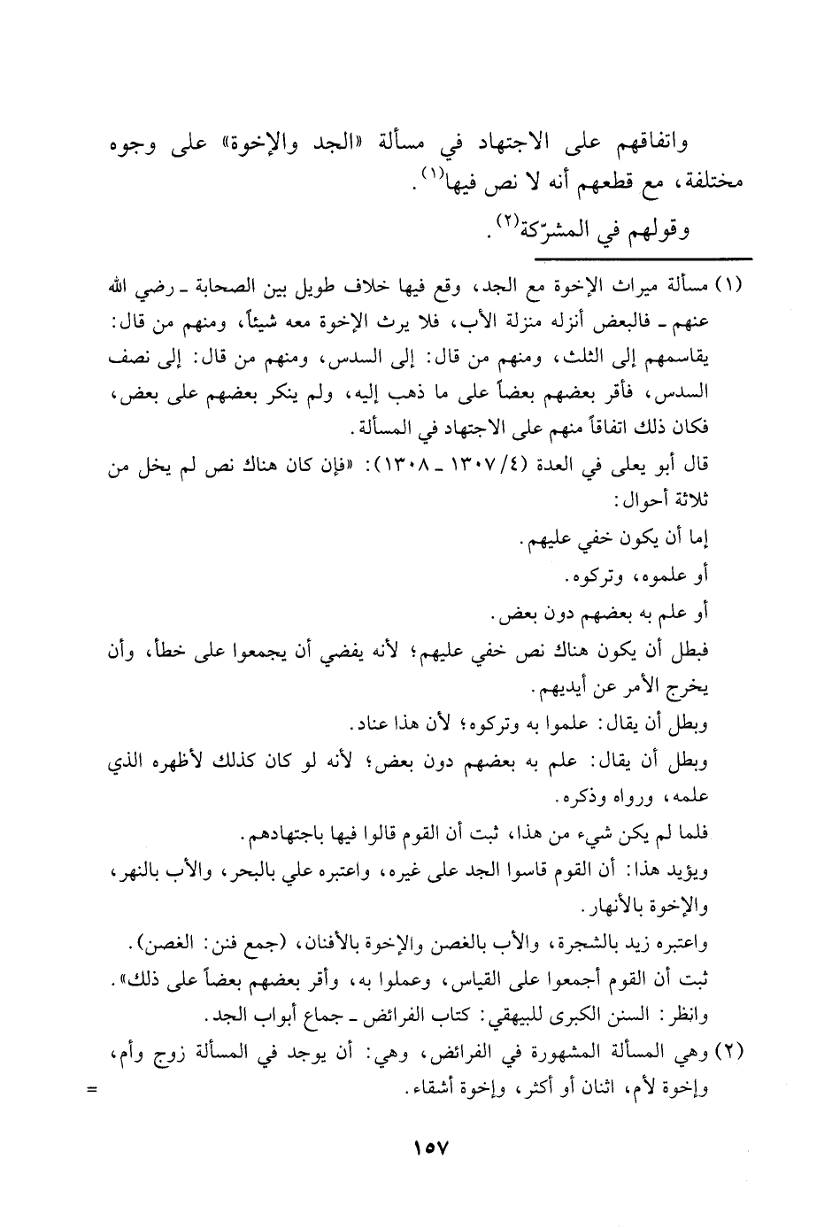 1 مسألة ميراث الإخوة مع الجد، وقع فيها خلاف طويل بين الصحابة -رضي الله عنهم- فالبعض أنزله منزلة الأب، فلا يرث الإخوة معه شيئًا، ومنهم من قال: يقاسمهم إلى الثلث، ومنهم من قال: إلى السدس، ومنهم من قال: إلى نصف السدس، فأقر بعضهم بعضًا على ما ذهب إليه، ولم ينكر بعضهم على بعض، فكان ذلك اتفاقًا منهم على الاجتهاد في المسألة.