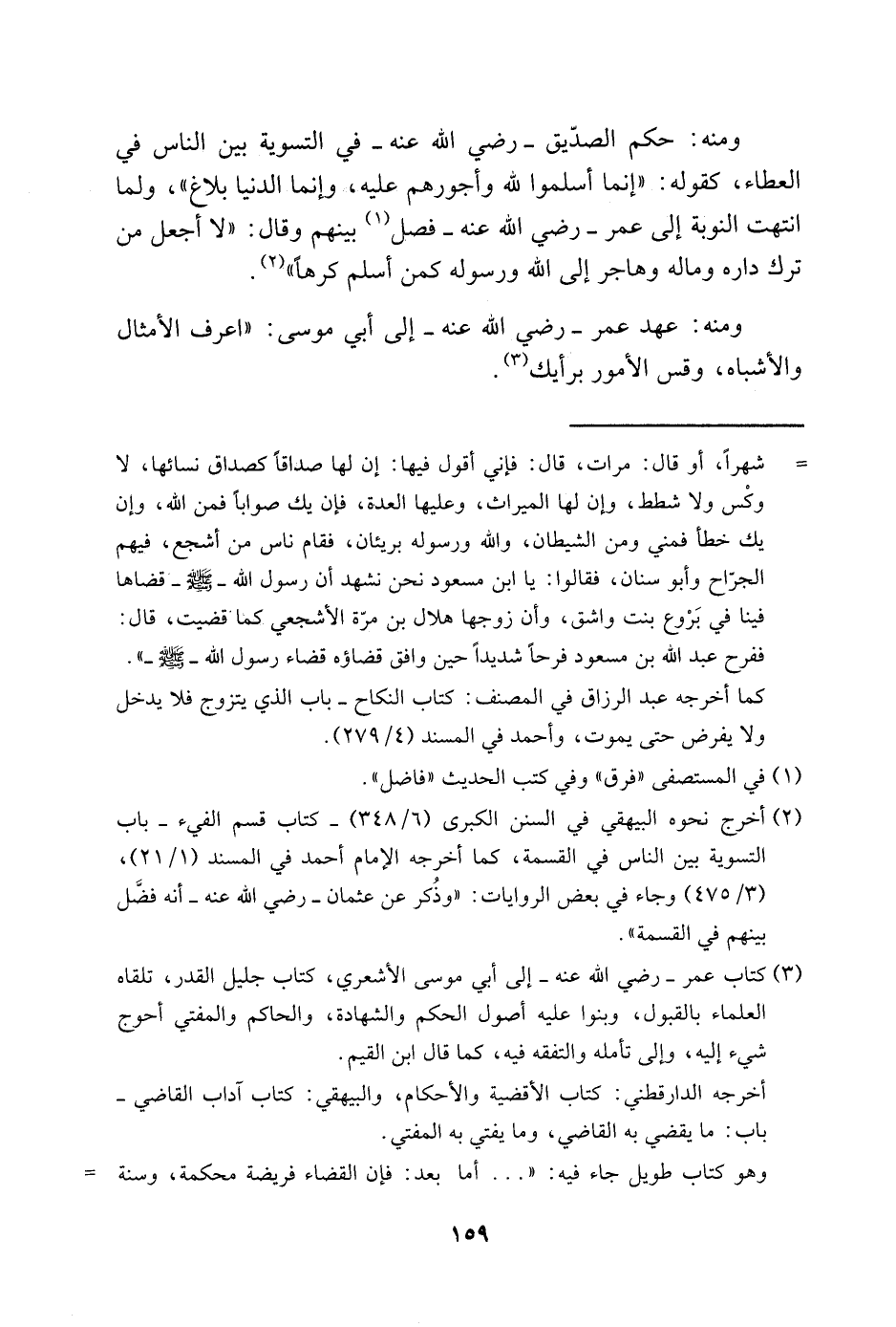 2 أخرج نحوه البيهقي في السنن الكبرى "6/ 348"- كتاب قسم الفيء، باب التسوية بين الناس في القسمة، كما أخرجه الإمام أحمد في المسند "1/ 21"، "3/ 475" وجاء في بعض الروايات: "وذكر عن عثمان، رضي الله عنه، أنه فضل بينهم في القسمة".