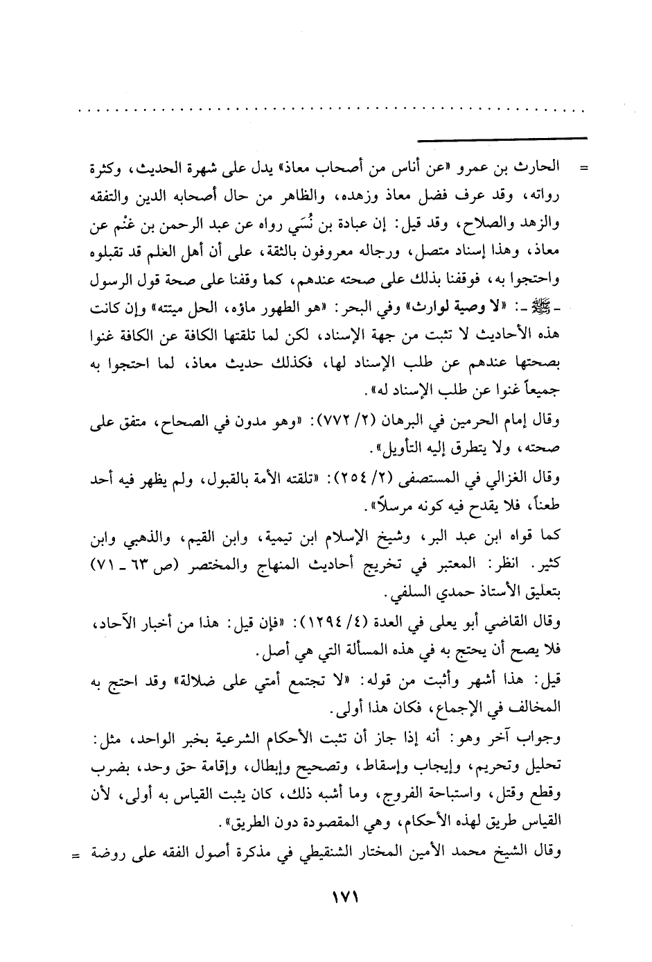 = الحارث بن عمرو "عن أناس من أصحاب معاذ" يدل على شهرة الحديث، وكثرة رواته، وقد عرف فضل معاذ وزهده، والظاهر من حال أصحابه الدين والتفقه والزهد والصلاح، وقد قيل: إن عبادة بن نُسَي رواه عن عبد الرحمن بن غنم عن معاذ وهذا إسناد متصل، ورجاله معروفون بالثقة، على أن أهل العلم قد تقبلوه واحتجوا به، فوقفنا بذلك على صحته عندهم، كما وقفنا على صحة قول الرسول الله، صَلّى الله عَلَيْهِ وَسَلّم: "لَا وَصِيّة لِوَارِث" وفي البحر: "هو الطهور ماؤه، الحل ميتته" وإن كانت هذه الأحاديث لا تثبت من جهة الإسناد، لكن لما تلقتها الكافة عن الكافة غنوا بصحتها عندهم عن طلب الإسناد لها، فكذلك حديث معاذ، لما احتجوا به جميعًا غنوا عن طلب الإسناد له".