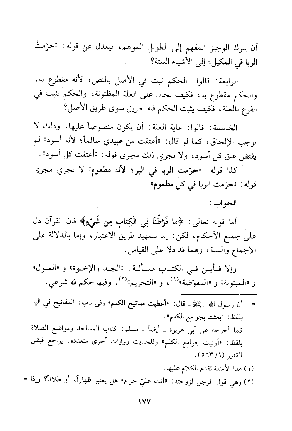 أما قوله تعالى: {مَا فَرَّطْنَا فِي الْكِتَابِ مِنْ شَيْءٍ} فإن القرآن دل على جميع الأحكام، لكن إما بتمهيد طريق الاعتبار، وإما بالدلالة على الإجماع والسنة، وهما قد دلا على القياس.