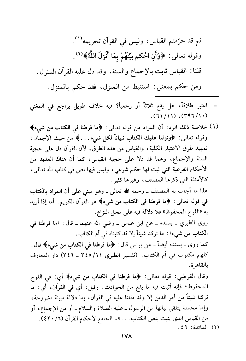 1 خلاصة ذلك الرد: أن المراد من قوله تعالى: {مَا فَرَّطْنَا فِي الْكِتَابِ مِنْ شَيْءٍ} وقوله تعالى: {وَنَزَّلْنَا عَلَيْكَ الْكِتَابَ تِبْيَانًا لِكُلِّ شَيْءٍ} من حيث الإجمال: تمهيد طرق الاعتبار الكلية، والقياس من هذه الطرق؛ لأن القرآن دل على حجية السنة والإجماع، وهما قد دلا على حجية القياس، كما أن هناك العديد من الأحكام الفرعية التي ثبت لها حكم شرعي، وليس فيها نص في كتاب الله تعالى، كالأمثلة التي ذكرها المصنف، وغيرها كثير.