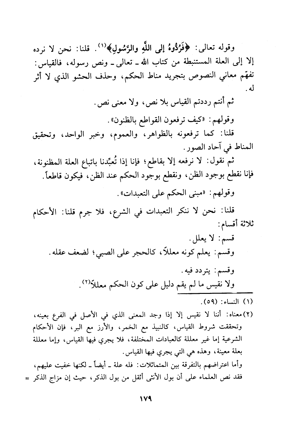 وقوله تعالى: {فَرُدُّوهُ إِلَى اللَّهِ وَالرَّسُولِ} 1. قلنا: نحن لا نرده إلا إلى العلة المستنبطة من كتاب الله -تعالى- ونص رسوله، فالقياس: تفهّم معاني النصوص بتجريد مناط الحكم، وحذف الحشو الذي لا أثر له.