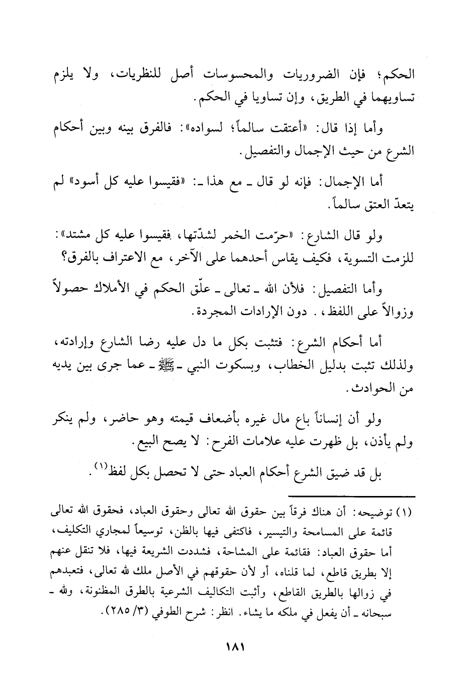 1 توضيحه: أن هناك فرقًا بين حقوق الله تعالى وحقوق العباد، فحقوق الله تعالى قائمة على المسامحة والتيسير، فاكتفى فيها بالظن، توسيعًا لمجاري التكليف، أما حقوق العباد: فقائمة على المشاحة، فشددت الشريعة فيها، فلا تنقل عنهم إلا بطريق قاطع، لما قلناه، أو لأن حقوقهم في الأصل ملك لله تعالى، فتعبدهم في زوالها بالطريق القاطع، وأثبت التكاليف الشرعية بالطرق المظنونة، ولله -سبحانه- أن يفعل في ملكه ما يشاء. انظر: شرح الطوفي "3/ 285".