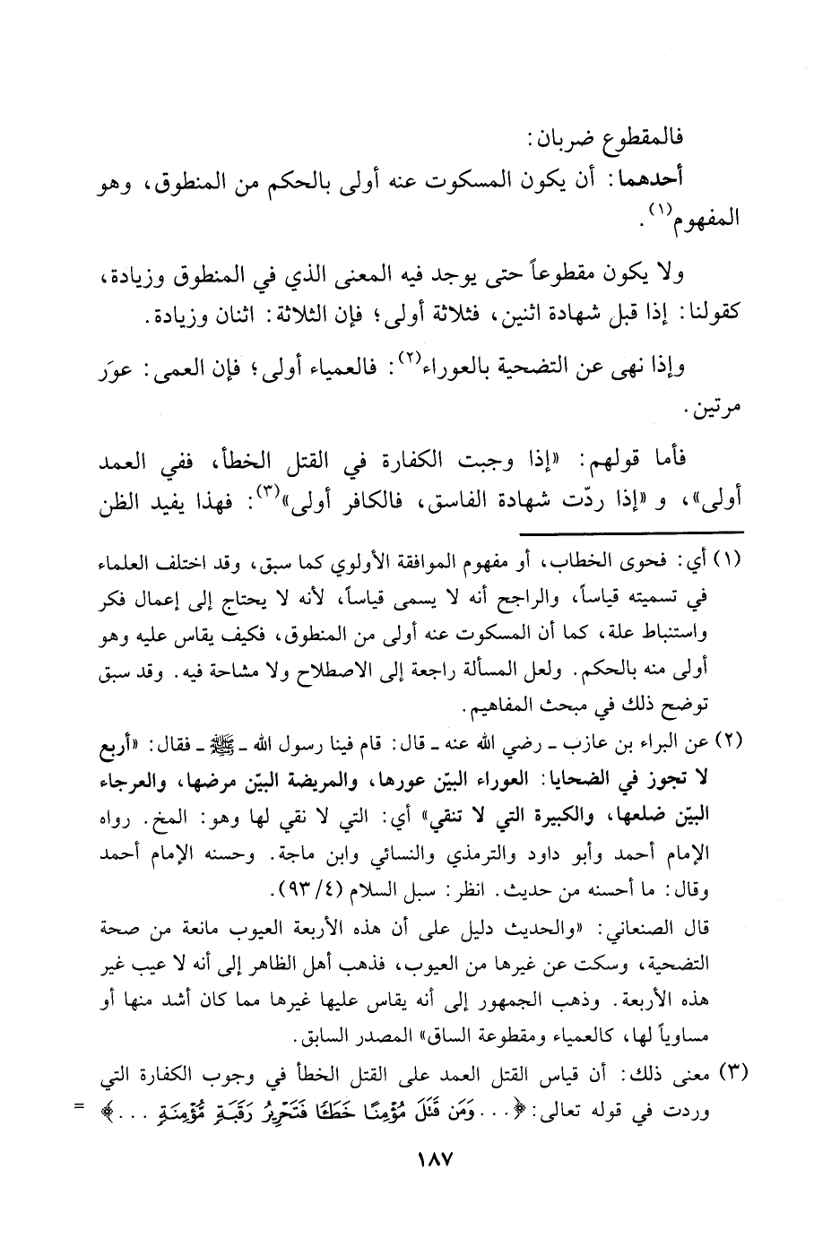 1 أي: فحوى الخطاب، أو مفهوم الموافقة الأولوي كما سبق، وقد اختلف العلماء في تسميته قياسًا، والراجح أنه لا يسمى قياسًا، لأنه لا يحتاج إلى إعمال فكر واستنباط علة، كما أن المسكوت عنه أولى من المنطوق، فكيف يقاس عليه وهو أولى منه بالحكم. ولعل المسألة راجعة إلى الاصطلاح ولا مشاحة فيه. وقد سبق توضيح ذلك في مبحث المفاهيم.