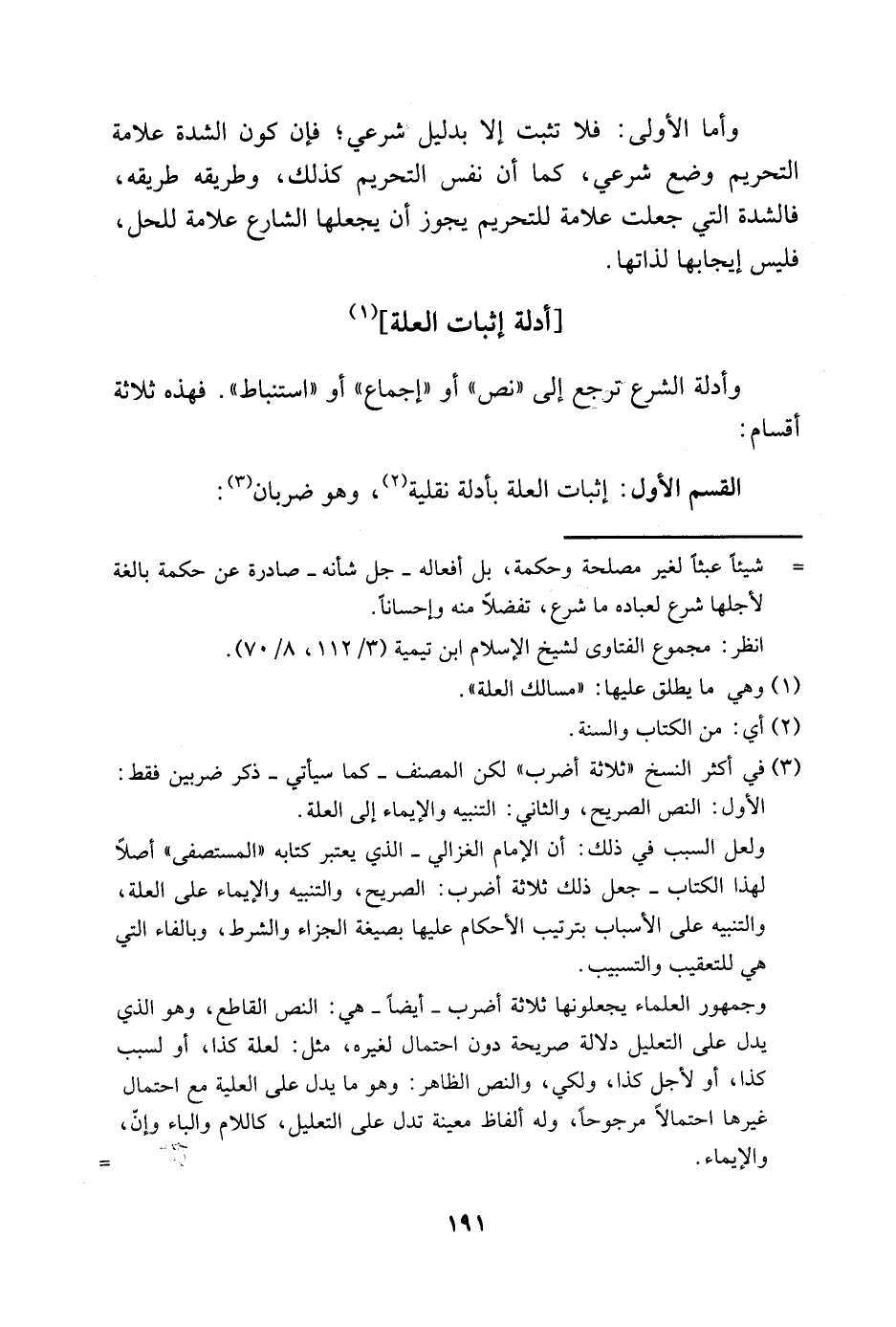 ولعل السبب في ذلك: أن الإمام الغزالي، الذي يعتبر كتابه "المستصفى" أصلًا لهذا الكتاب، جعل ذلك ثلاثة أضرب: الصريح، والتنبيه والإيماء على العلة، والتنبيه على الأسباب بترتيب الأحكام عليها بصيغة الجزاء والشرط، وبالفاء التي هي للتعقيب والتسبيب.