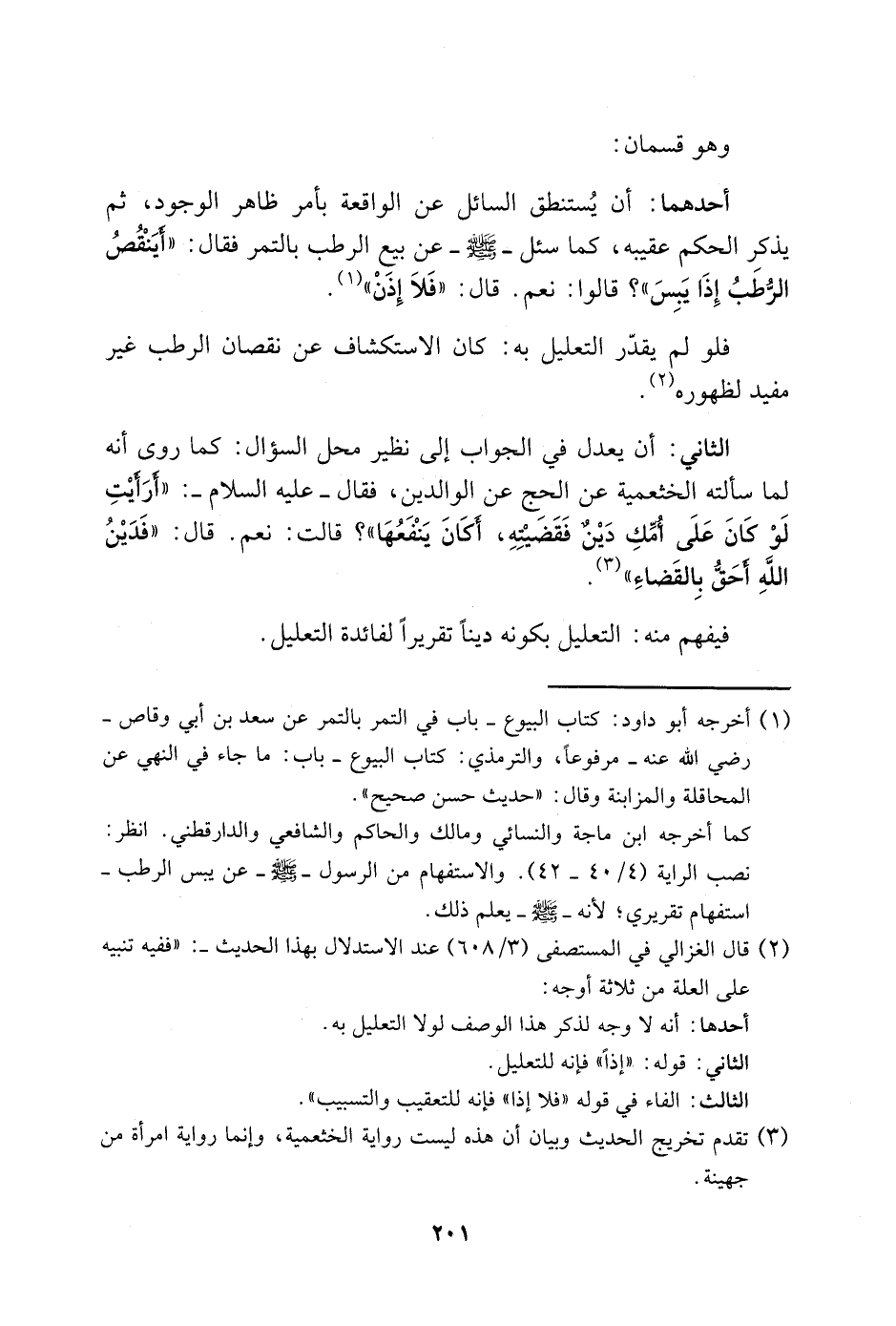 2 قال الغزالي في المستصفى "3/ 608"، عند الاستدلال بهذا الحديث: ففيه تنبيه على العلة من ثلاثة أوجه.
