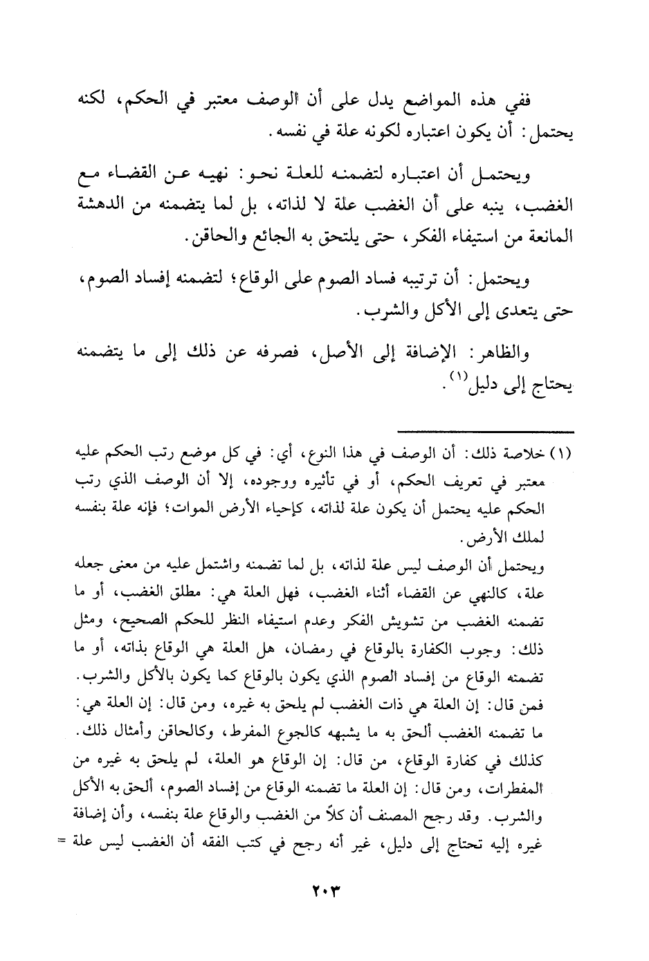 ويحتمل أن الوصف ليس علة لذاته، بل لما تضمنه واشتمل عليه من معنى جعله علة، كالنهي عن القضاء أثناء الغضب، فهل العلة هي: مطلق الغضب، أو ما تضمنه الغضب من تشويش الفكر وعدم استيفاء النظر للحكم الصحيح، ومثل ذلك: وجوب الكفارة بالوقاع في رمضان، هل العلة هي الوقاع بذاته، أو ما تضمنه الوقاع من إفساد الصوم الذي يكون بالوقاع كما يكون بالأكل والشرب.