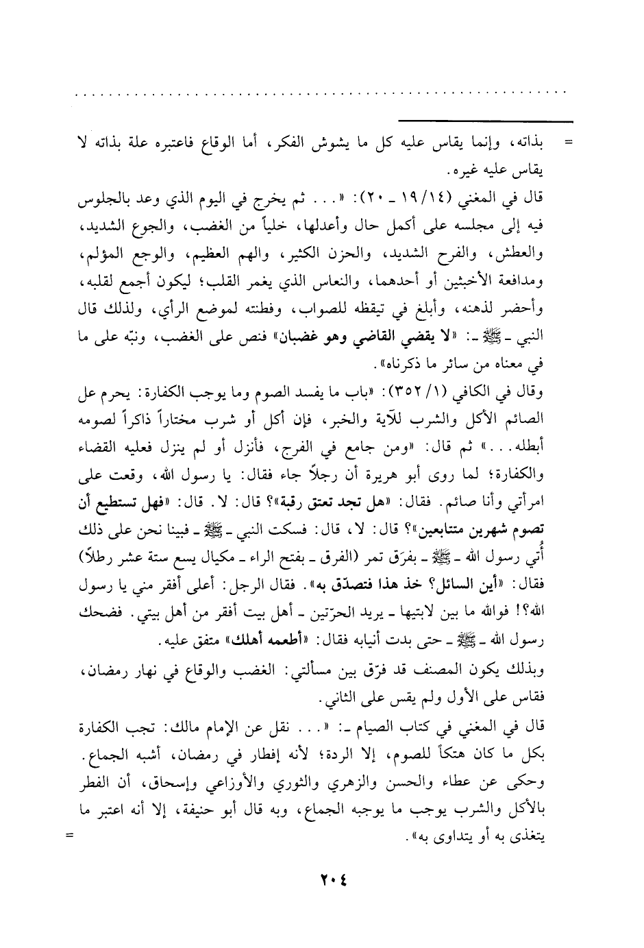 وقال في الكافي: "1/ 352": "باب ما يفسد الصوم وما يوجب الكفارة: يحرم على الصائم الأكل والشرب للآية والخبر، فإن أكل أو شرب مختارًا ذاكرًا لصومه أبطله ... " ثم قال: "ومن جامع في الفرج، فأنزل أو لم ينزل فعليه القضاء والكفارة، لما روى أبو هريرة أن رجلًا جاء فقال: يا رسول الله، وقعت على امرأتي وأنا صائم. فقال: "هل تجد تعتق رقبة"؟ قال: لا. قال: "فهل تستطيع أن تصوم شهرين متتابعين"؟ قال: لا قال: فسكت النبي -صَلّى الله عَلَيْهِ وَسَلّم- فبينا نحن على ذلك أتى رسول الله -صَلّى الله عَلَيْهِ وَسَلّم- بفرَق تمر "الفرَق: بفتح الراء -مكيال يسع ستة عشر رطلًا". فقال: "أين السائل؟ خذ هذا فتصدق به" فقال الرجل: أعلى أفقر مني يا رسول الله؟! فو الله ما بين لا بتيها -يريد الحرّتين- أهل بيت أفقر من أهل بيتي فضحك رسول الله -صَلّى الله عَلَيْهِ وَسَلّم- حتى بدت أنيابه فقال: "أطعمه أهلك" متفق عليه.