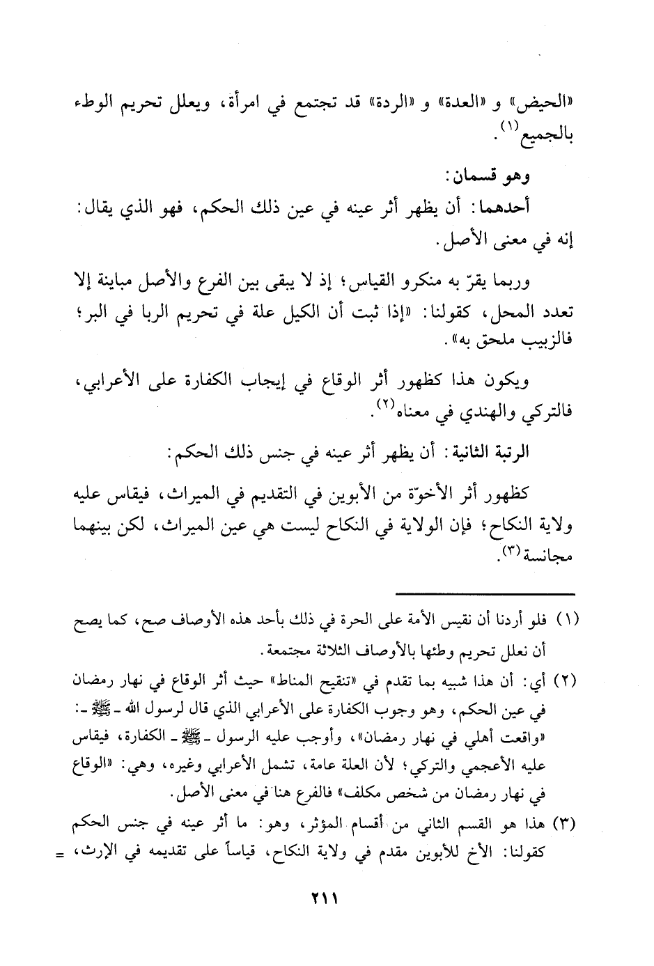 2 أي: أن هذا شبيه بما تقدم في "تنقيح المناط" حيث أثر الدفاع في نهار رمضان في عين الحكم، وهو وجوب الكفارة على الأعرابي الذي قال لرسول الله، صَلّى الله عَلَيْهِ وَسَلّم: "واقعت أهلي في نهار رمضان"، وأوجب عليه رسول الله -صَلّى الله عَلَيْهِ وَسَلّم- الكفارة، فيقاس عليه الأعجمي والتركي؛ لأن العلة عامة، تشمل الأعرابي وغيره، وهي: "الوقاع في نهار رمضان من شخص مكلف" فالفرع هنا في معنى الأصل.