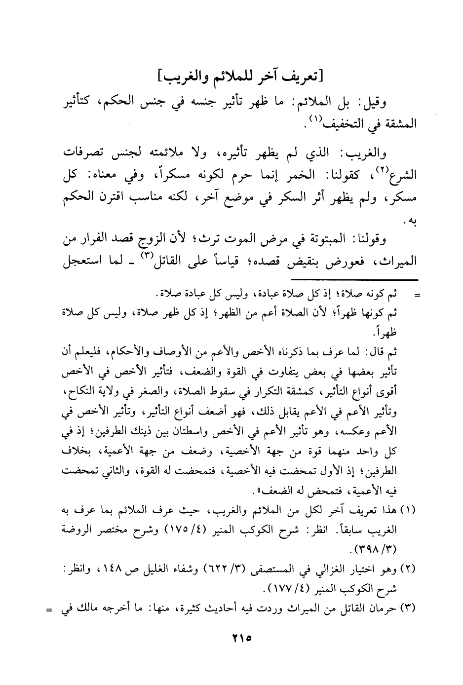 1 هذا تعريف آخر لكل من الملائم والغريب، حيث عرف الملائم بما عرف به الغريب سابقًا. انظر: شرح الكوكب المنير "4/ 175" وشرح مختصر الروضة "3/ 398".