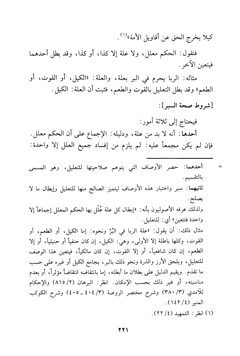 مثال ذلك: أن يقول: "علة الربا في البُرِّ ونحوه: إما الكيل، أو الطعم، أو القوت، وكلها باطلة إلا الأولى، وهي: الكيل، إن كان حنفيًّا أو حنبليًّا، أو إلا الطعم، إن كان شافعيًا، أو إلا القوت، إن كان مالكيًّا، فيتعين هذا الوصف للتعليل، ويلحق الأرز والذرة ونحو ذلك بالبر، بجامع الكيل أو غيره على حسب ما تقدم. ويقيم الدليل على بطلان ما أبطله، إما بانتقاضه انتقاضًا مؤثرًا، أو بعدم مناسبته، أو غير ذلك بحسب الإمكان. انظر: البرهان "2/ 815" والإحكام للآمدي "3/ 380" وشرح مختصر الروضة "3/ 404-405" وشرح الكوكب المنير "4/ 142".
